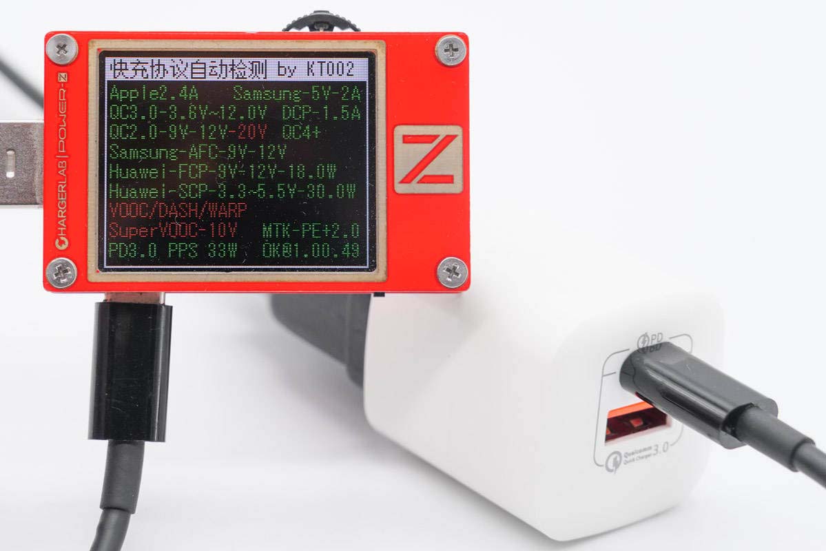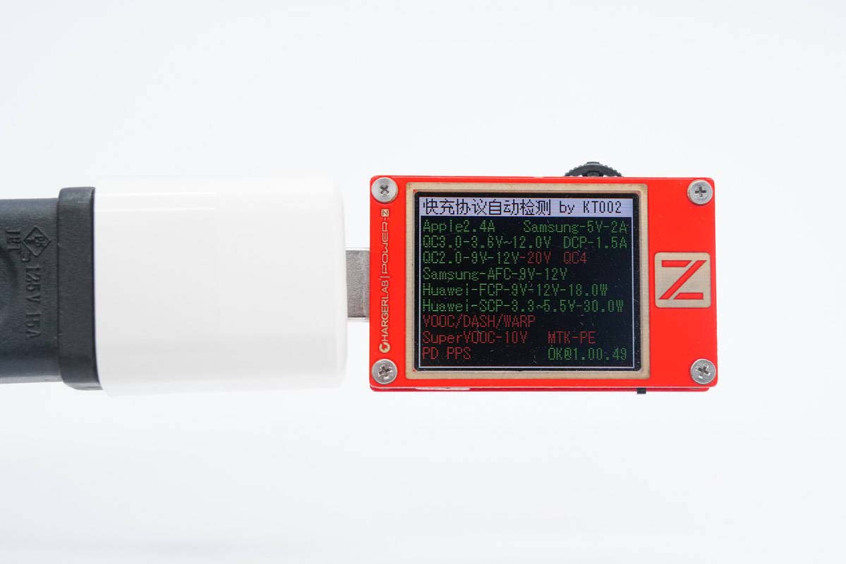 使用ChargerLAB POWER-Z KT002测得USB-A口支持Apple 2.4A、Samsung 5V2A、DCP协议,以及QC2.0/3.0、AFC、FCP、SCP快充协议。