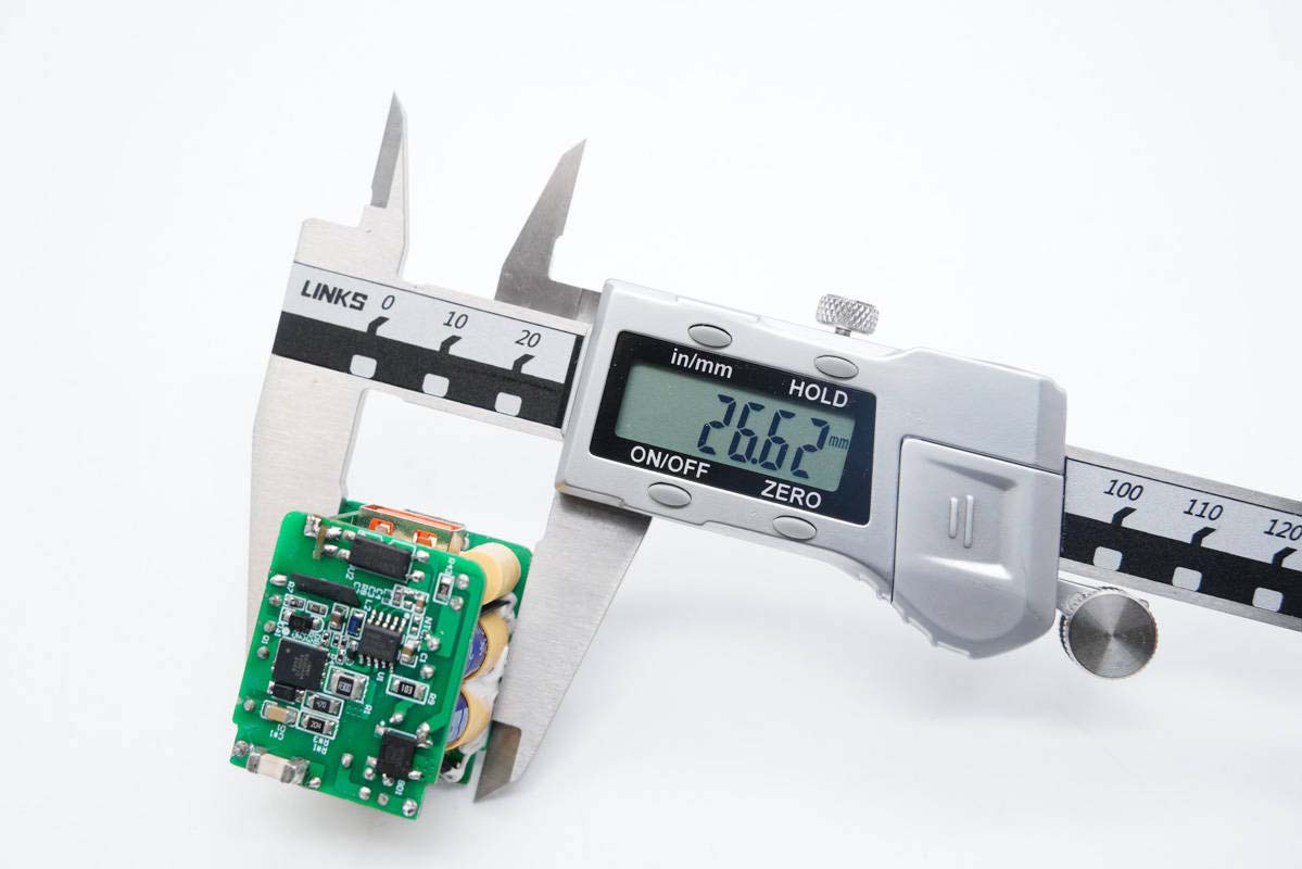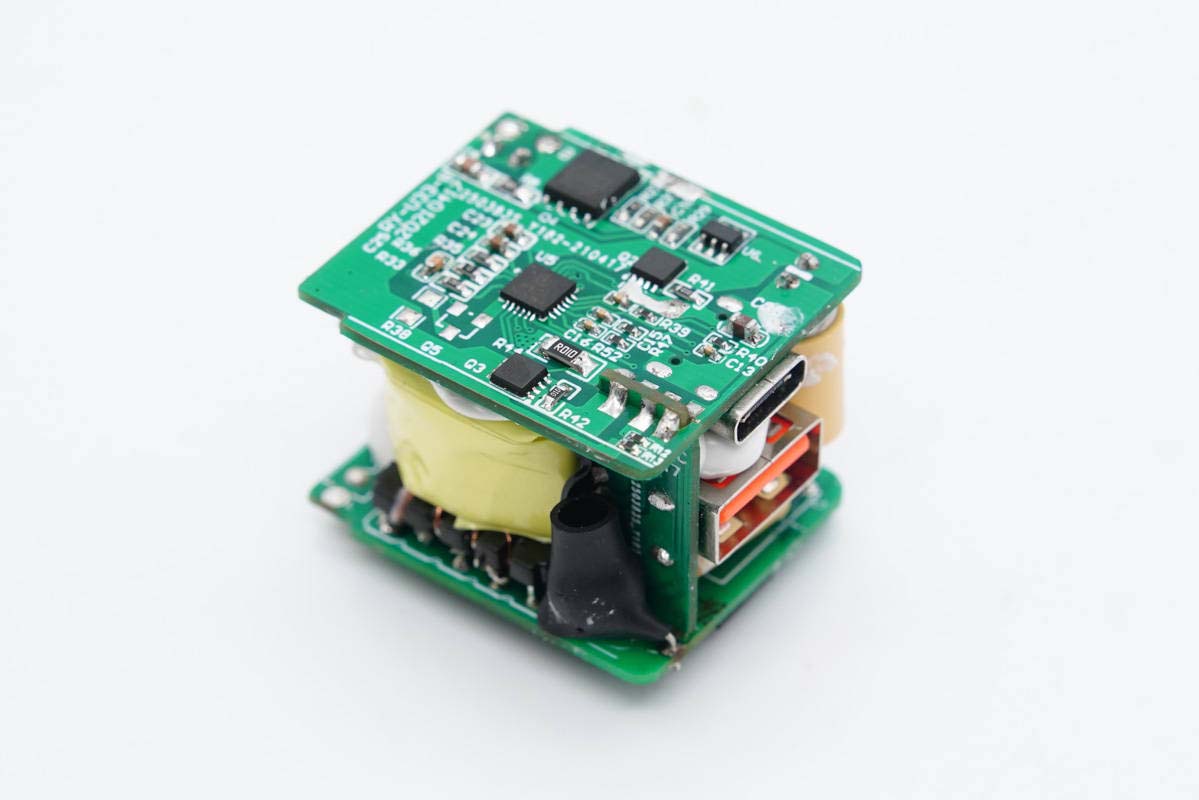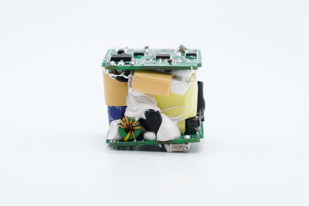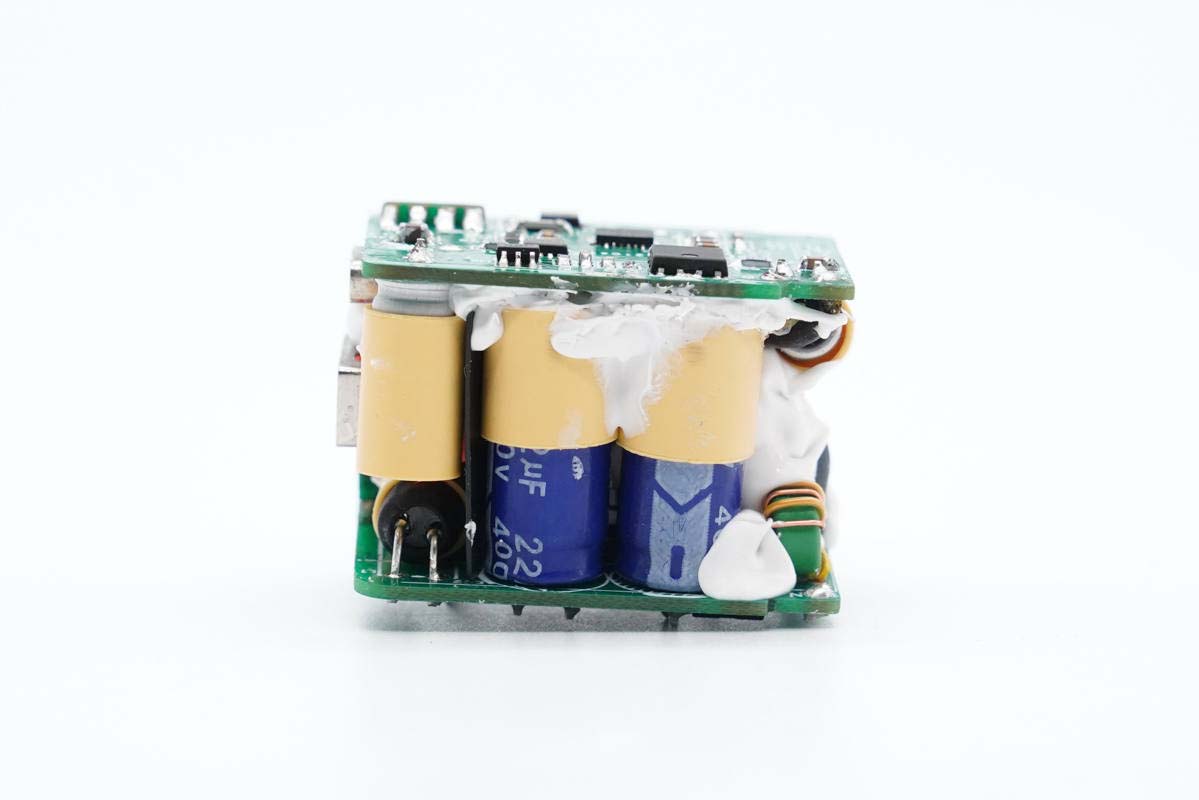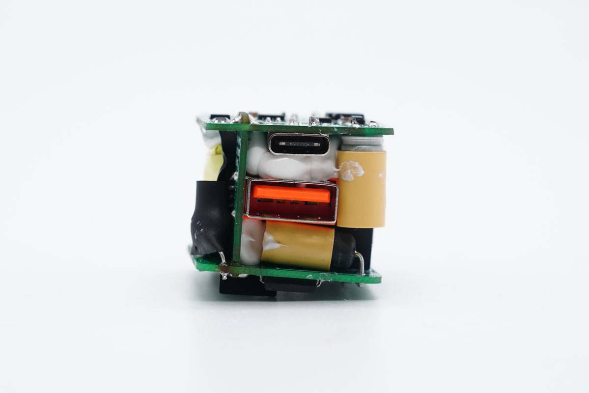 充电头网拆解了解到,由聚泉鑫设计的这个DEMO整体尺寸做到了33.99*26.62*24.93mm,功率密度达到了1.46W/cm³之高,做得非常小巧。其采用三块小板组合焊接设计,其中连接小板上设USB-A母座,巧妙解决了迷你双口快充的母座布局问题。另外整个模块打胶加固,全部滤波电容套有绝缘胶套,初次级间设有隔离板。