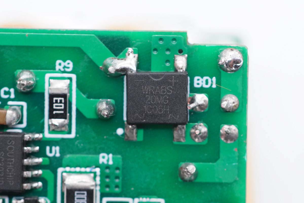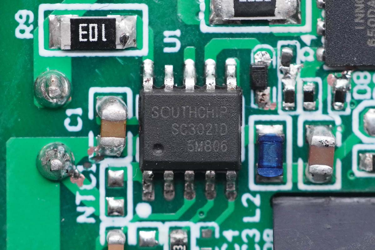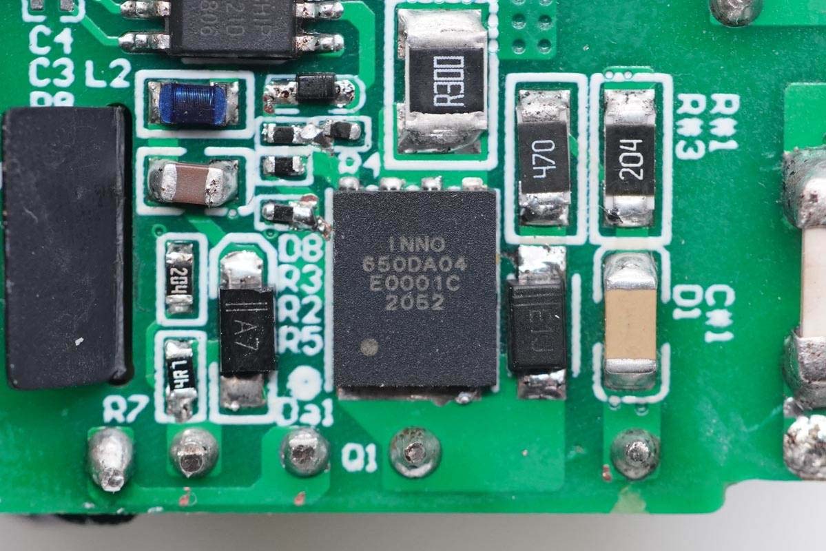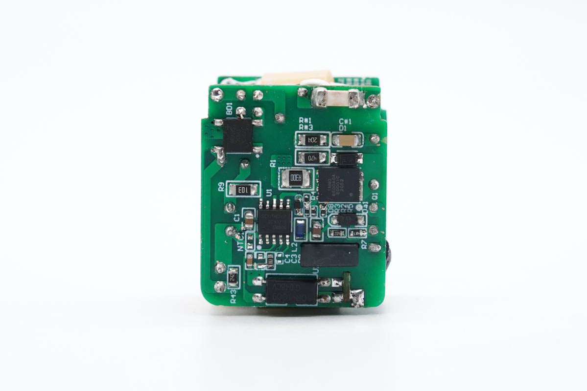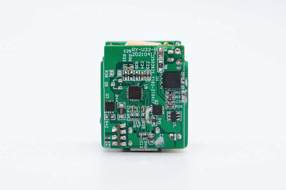 输入端小板背面除了保险丝,还有整流桥、主控芯片、氮化镓功率开关管以及光耦。