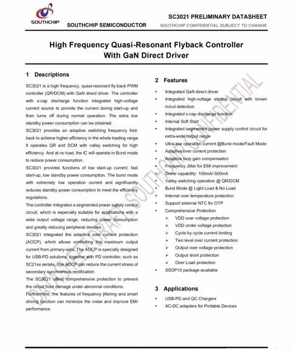 据了解,南芯SC3021x满足各类高频QR快充需求,采用专有的GaN直驱设计,省去外置驱动器或者分立驱动器件;集成分段式供电模式,单绕组供电,无需复杂的供电电路;内置高压启动及交流输入Brown In/Out功能,集成了X-cap放电功能。