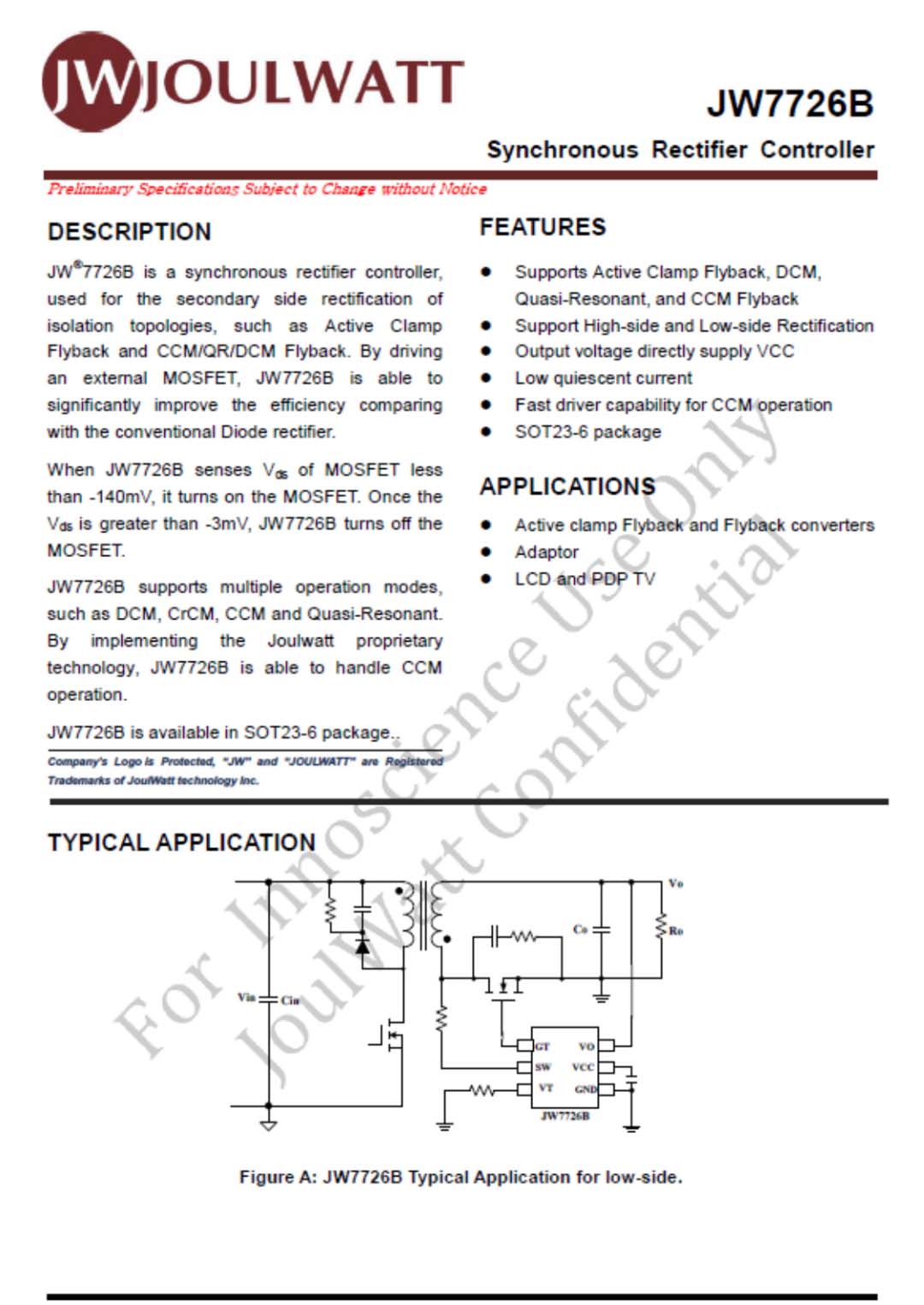 同步整流控制器采用杰华特JW7726B,支持CCM、DCM、QR和ACF模式,在振铃期间能有效防止同步整流MOSFET的误开通;具有快速关断能力以便能兼容CCM;在启动过程中(VCC建立之前)能有效防止门极gate被耦合至开启电压。据了解,目前JW7726系列产品累计发货量已接近千万颗。