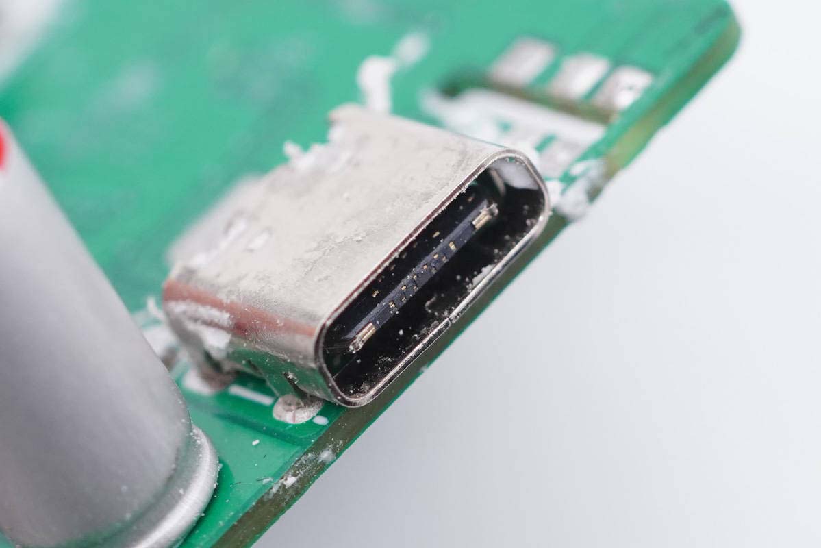 USB-C母座特写,过孔焊接。