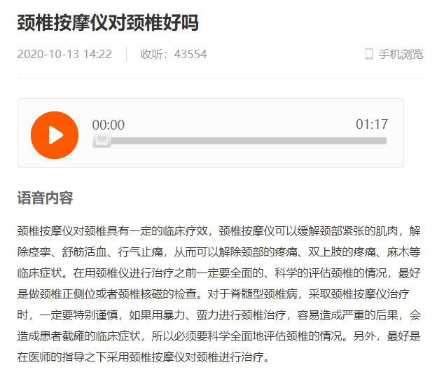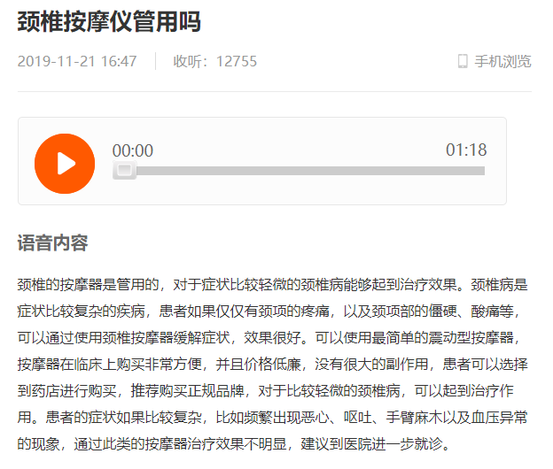 笔者在网上一些问医平台找到相关的颈部按摩仪问答,作用、效果以及副作用都非常详尽、专业,大家可以引为参考。