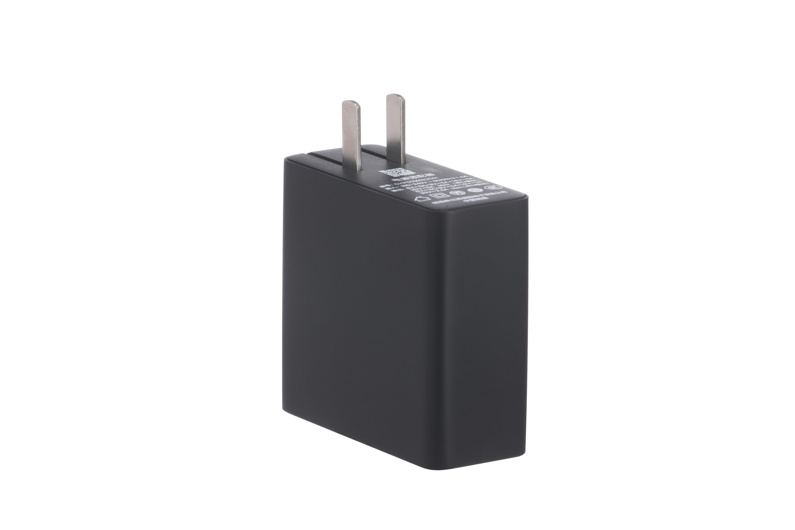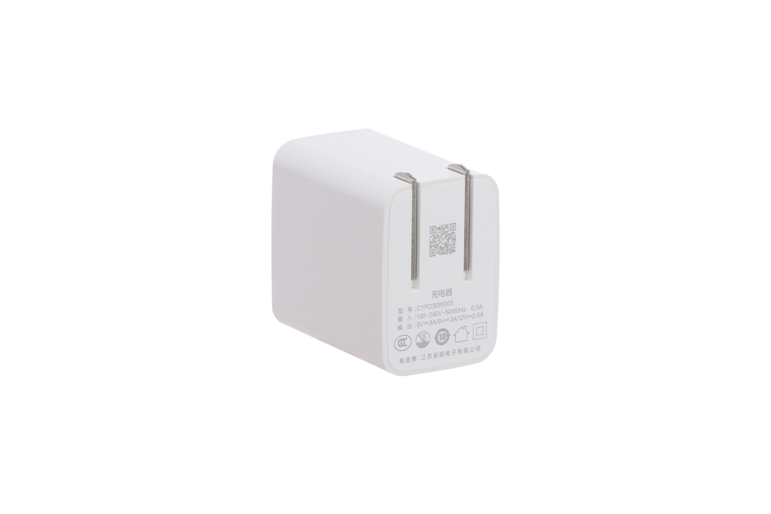 辰阳33W超级硅快充充电器机身尺寸仅为35x30x30mm,造型趋于小方块,采用固定式国标插脚,通过了国家CCC安规认证。
