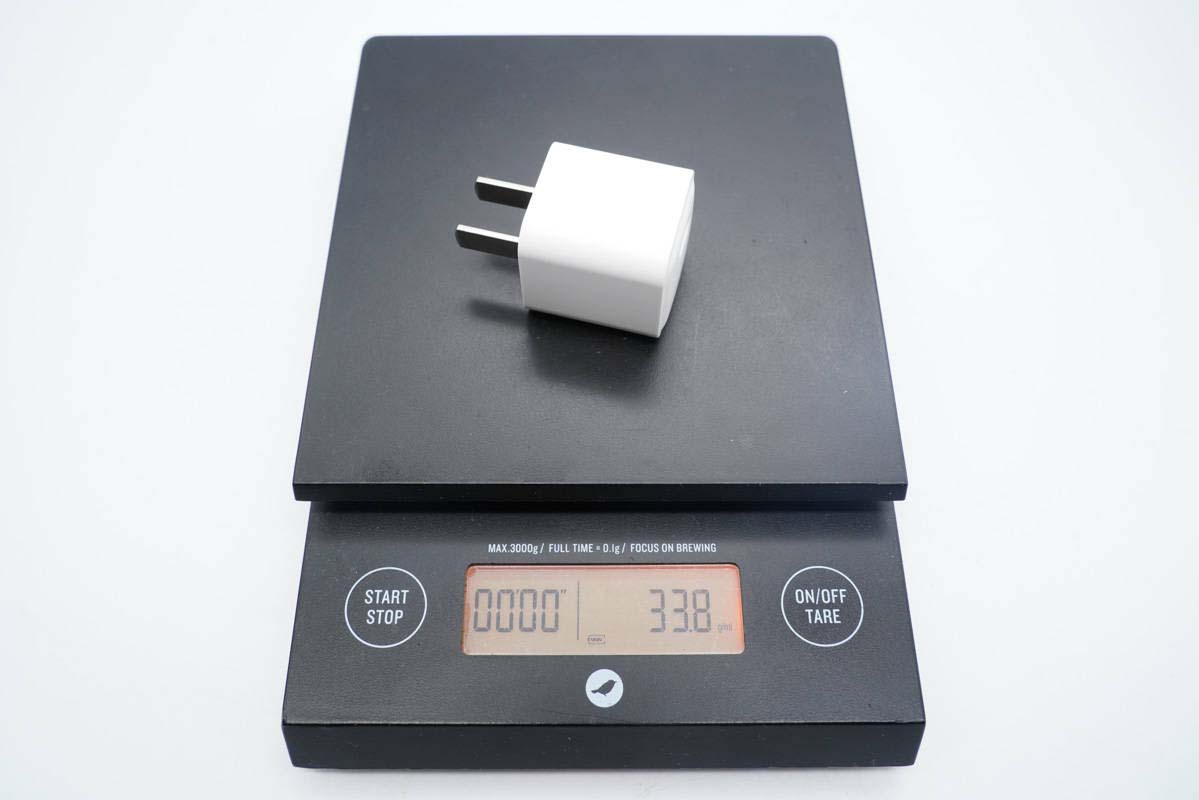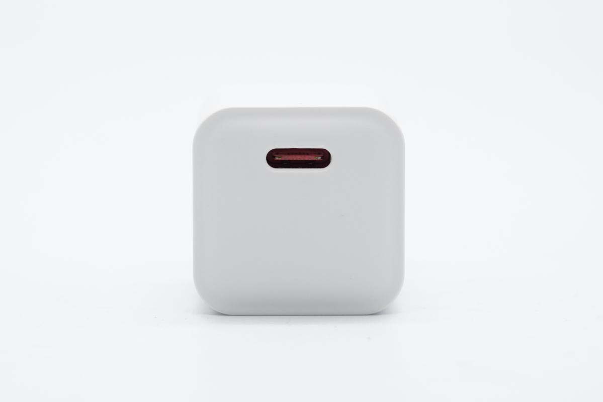 这款充电器非常小巧,造型为常见的小方块设计。外壳采用白色PC材质,表面哑光,输出顶面微凸,整体十分简洁。