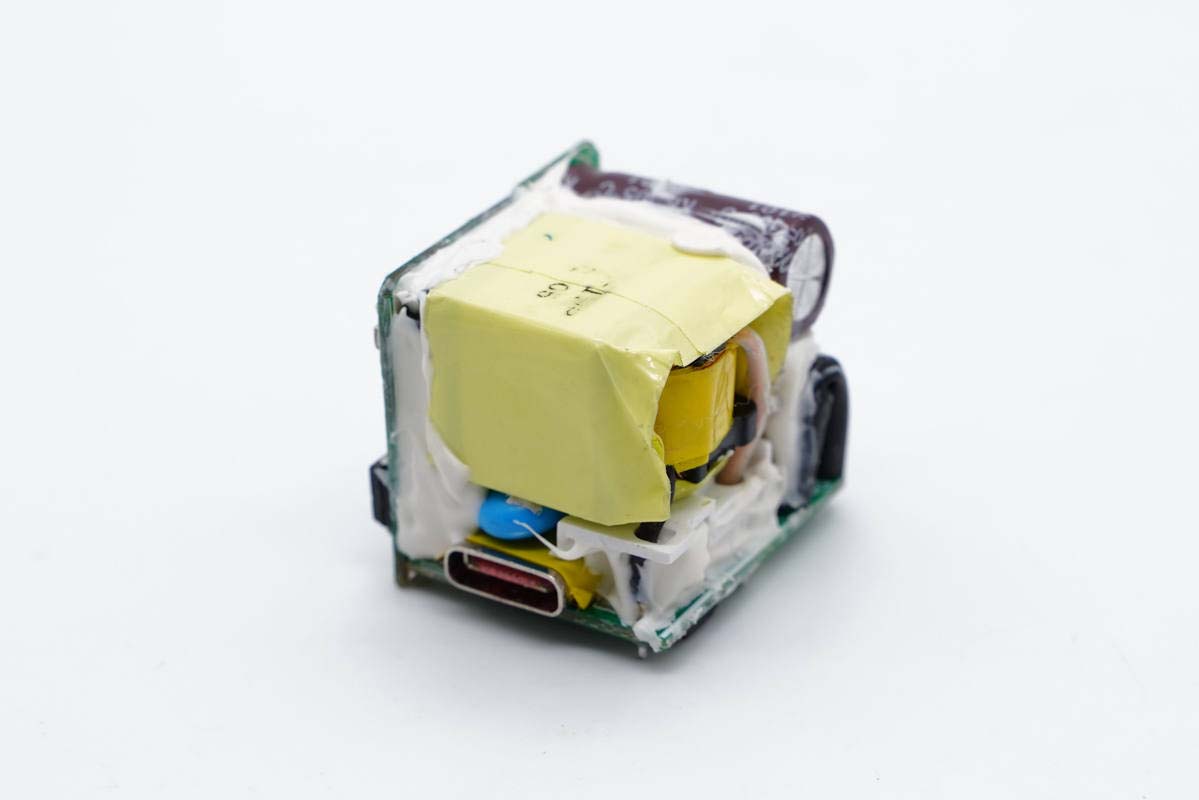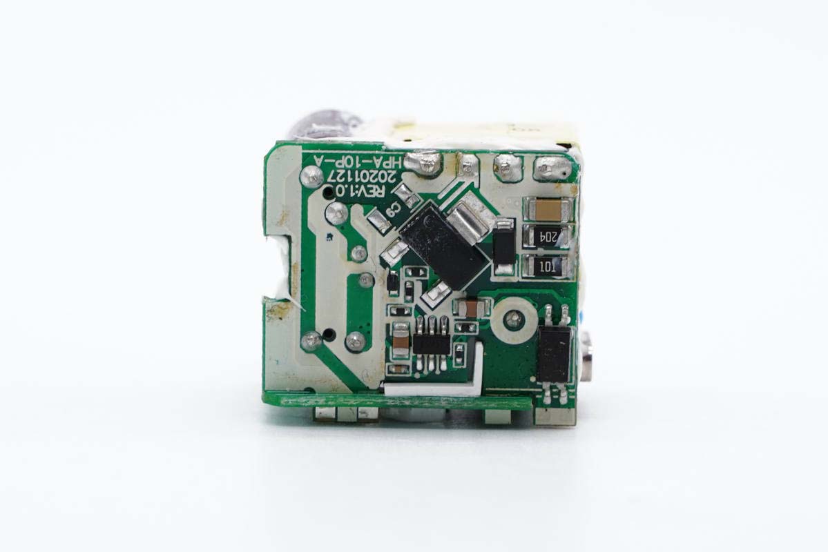 充电头网通过拆解了解到,充电器PCBA模块由两块小板组成,通过小板组合的结构,将元器件布置在这么小的空间内。初次级间设有隔离板进行隔离,USB母座还粘贴胶带加强绝缘。此外元器件间打胶填充固定,保证整体稳定性,做工讲究。