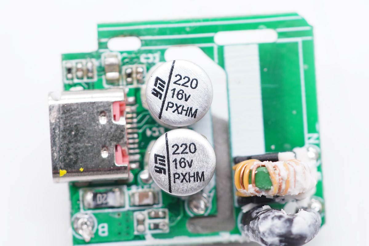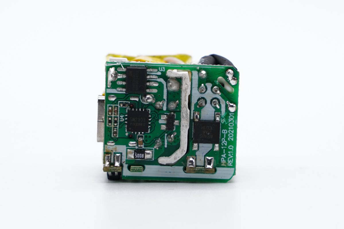 充电器采用了芯朋微AP8268+PN8309H快充方案,以及智融高通QC5认证协议芯片SW2303,整体集成度很高。可以看到高集成的加持下,产品外围电路变得非常简洁,对产品小型化以及降低系统成本非常有帮助。同时采用永铭小体积电解电容和固态电容进行滤波,对压缩体积也很有帮助,因此造就了这么一款小巧的迷你充。