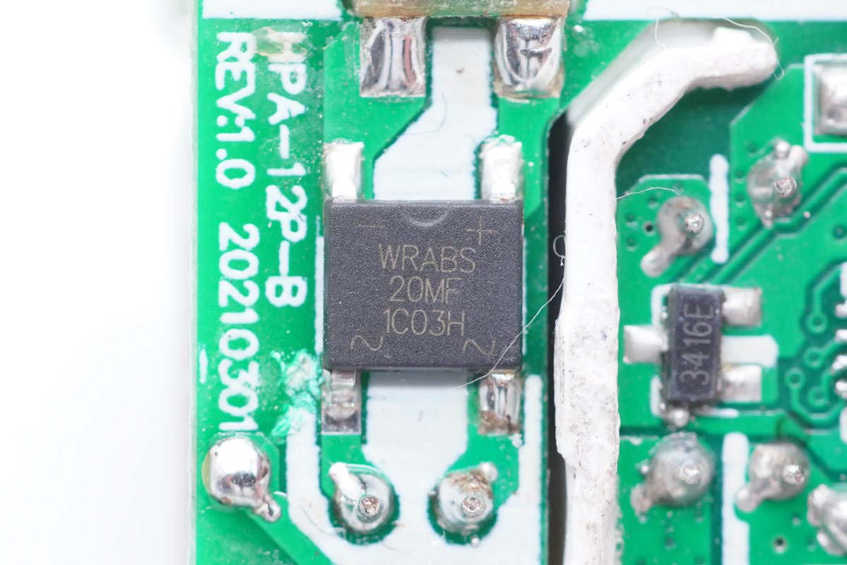 小板背面初次级间镂空穿过隔离板,初级侧设有一颗整流桥,次级侧有同步整流芯片和协议芯片,集成度高外围电路相当简洁。