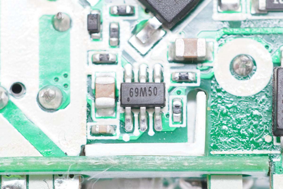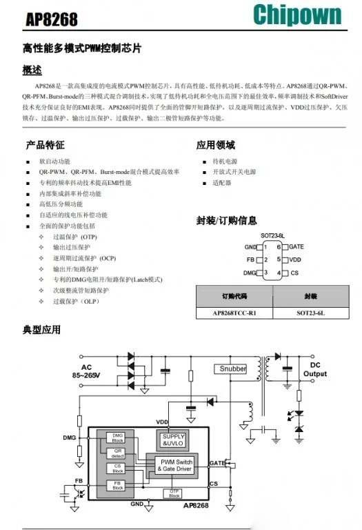 充电器主控芯片丝印69M50,实际是芯朋微AP8268。这是一款高集成度的电流模式PWM控制芯片,具有高性能、低待机功耗、低成本、多重保护等特点。其通过QR-PWM、QR-PFM、Burst-mode的三种模式混合调制技术,实现了低待机功耗和全电压范围下的最佳效率,频率调制技术和SoftDriver技术充分保证良好的EMI表现。