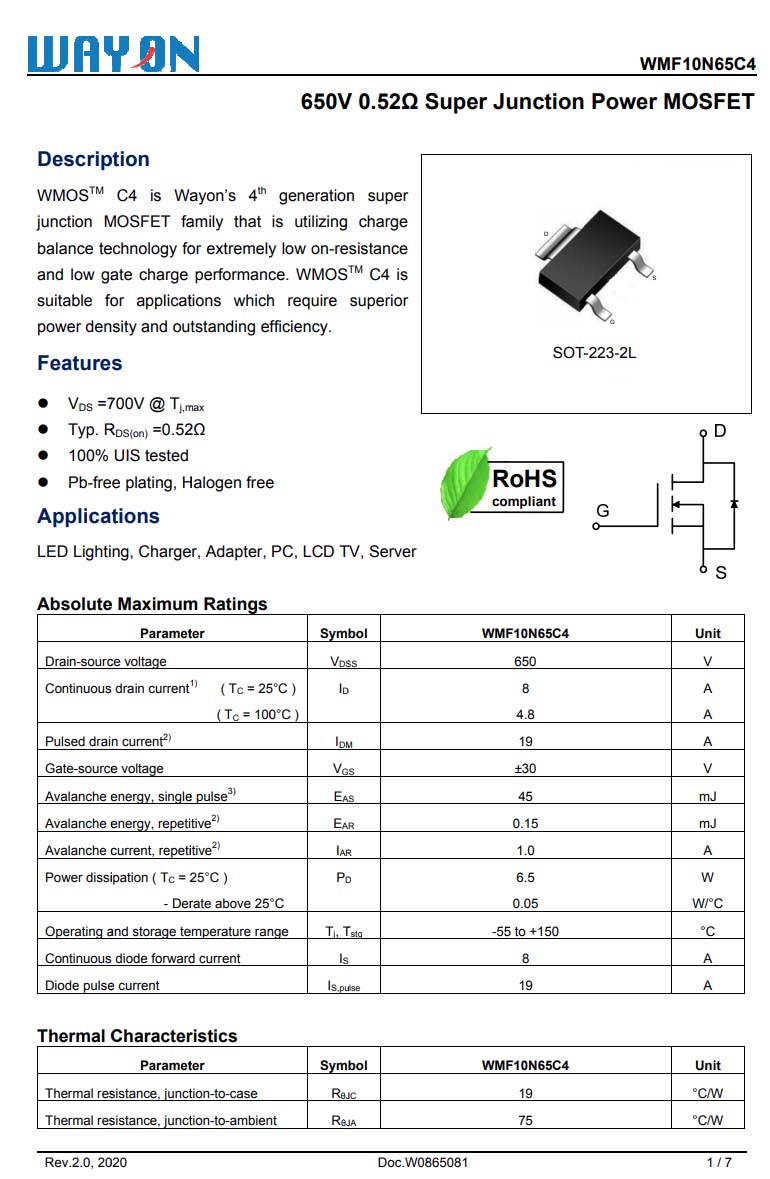 初级开关MOS管来自维安,型号WMF10N65C4。超结NMOS管,耐压650V,导阻0.52Ω,SOT223封装。