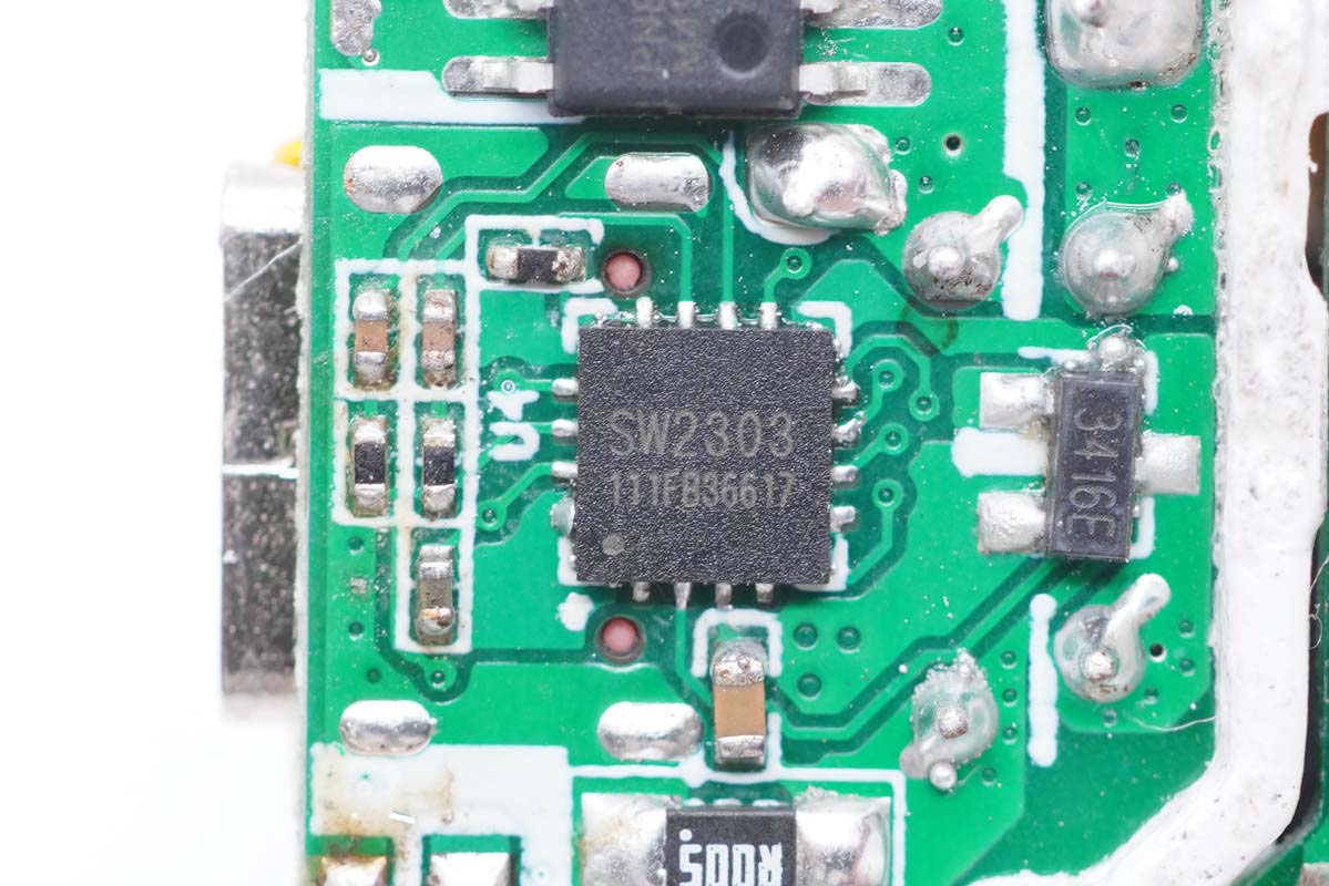 协议芯片采用珠海智融SW2303,通过高通QC5认证,是业内第一颗非MCU架构的QC5认证协议芯片。这是一款高集成度USB Type-C/Type-A接口快充协议芯片,支持PD、QC、FCP、高低压SCP、AFC、SFCP以及PE等主流快充协议;支持光耦反馈和FB反馈两种工作模式;支持4KV ESD HBM。