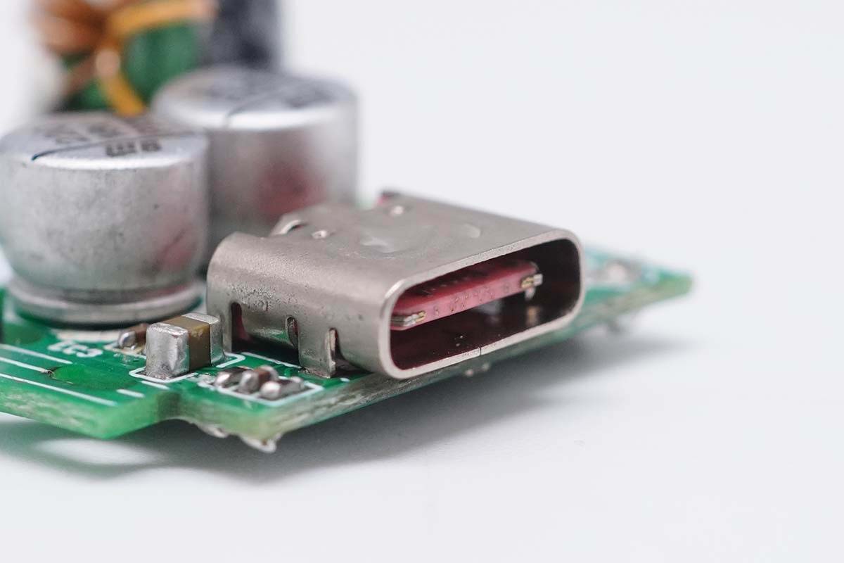 USB-C母座过孔焊接,橙色胶芯不露铜,夹钢片更加耐用。