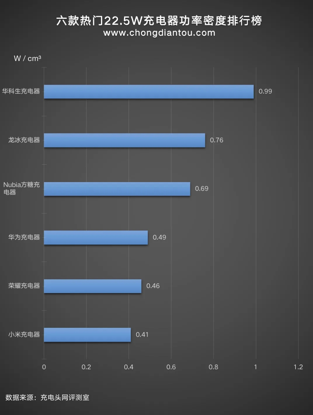 经计算,华科生22.5W充电器的体积约为 24.30 cm³,以最高输出 22.5W 计算,功率密度约为 0.99W / cm³。小编寻找了目前市面上较热门的22.5W充电器的功率密度数据汇总到柱状图,功率密度值越高证明同等功率参数下充电器的体积越小,从上面可以看出华科生的这款22.5W充电器的功率密度值为0.92,排在柱状图的首位。