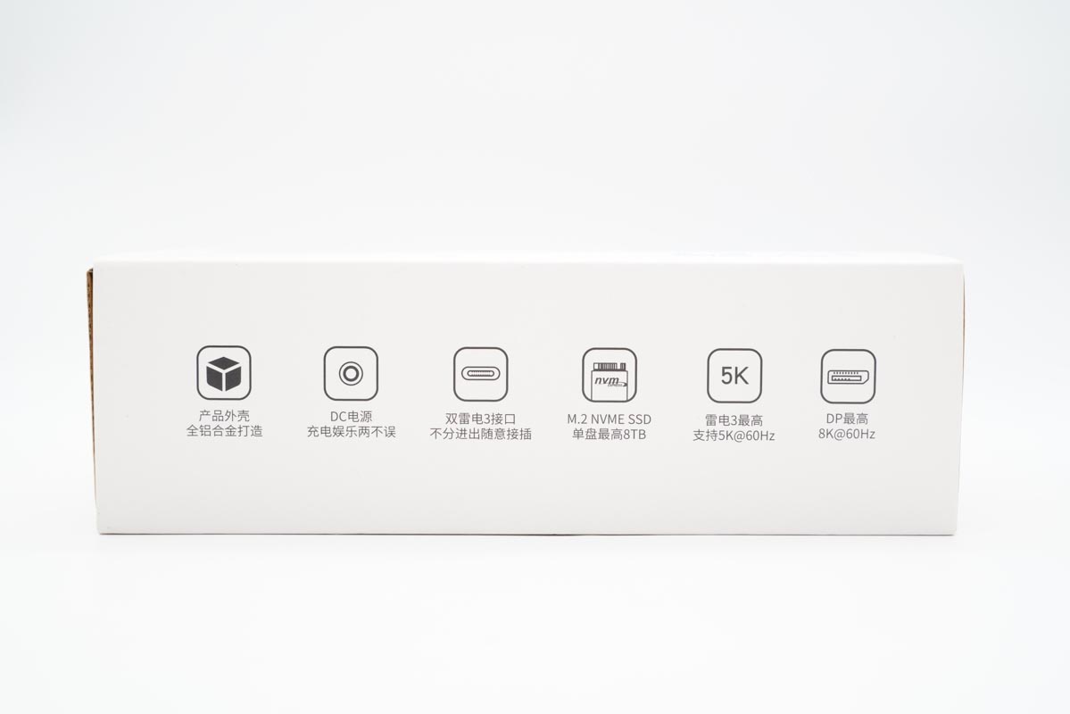 从包装盒侧面可以看出这款产品的几大特点,全铝合金打造、DC电源充电娱乐两不误、双雷电3接口不分进出随意接插、M.2 Nvme SSD单盘最高8TB、雷电3最高支持5K@60Hz、DP最高8K@60Hz。