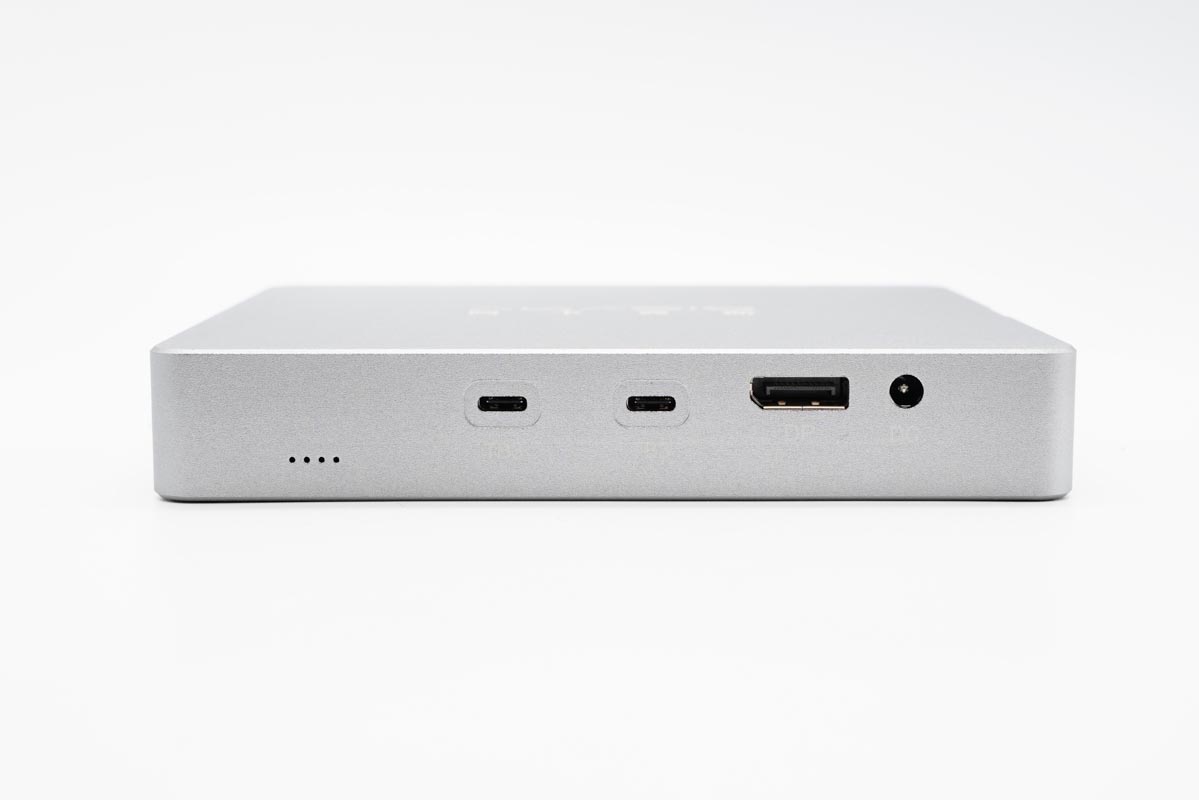 侧面放置着接口,分别为2个雷电3接口,USB-C物理接口形态,DP接口以及DC电源输入接口。