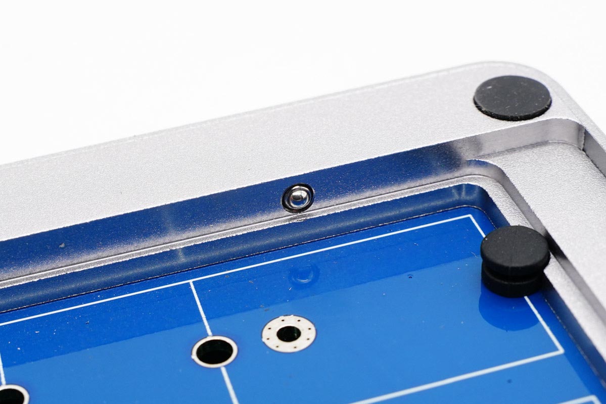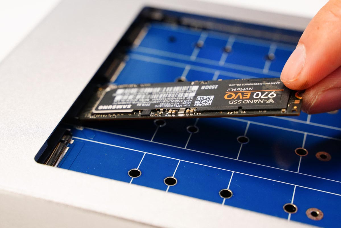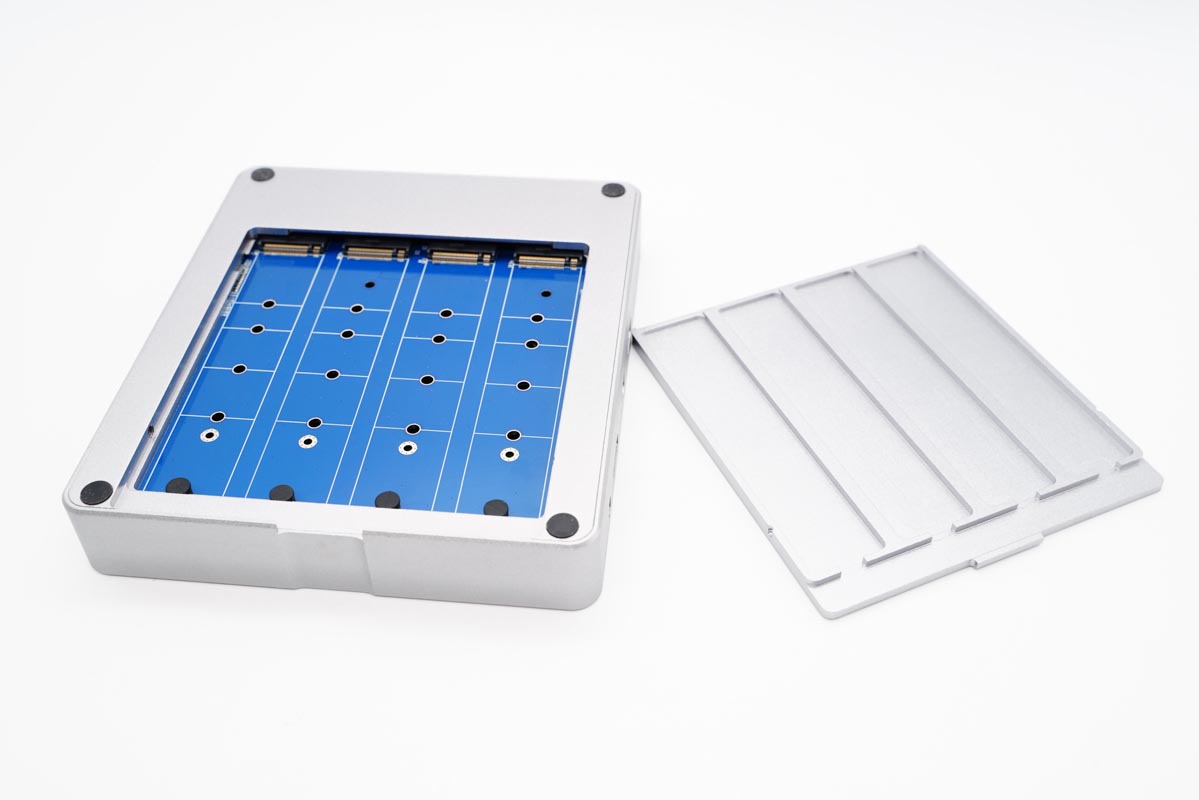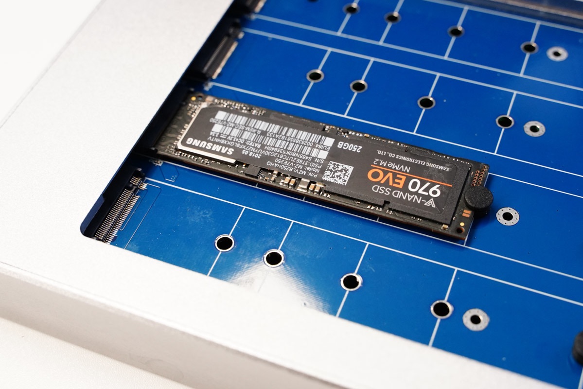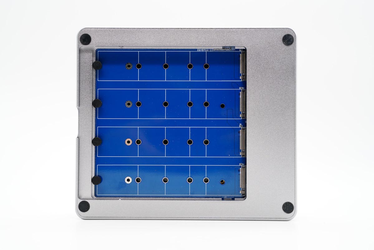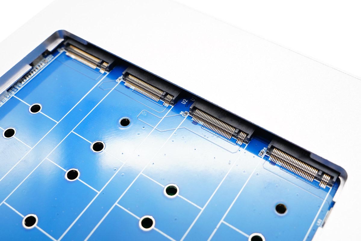 打开盖板,背面即为固态硬盘的插槽。小编拿到的是四盘位的版本,型号TB3SD4,这样就很好理解了。盘位的左侧自带四个硬盘固定胶钉,这也是为22110尺寸的固态硬盘而准备的。