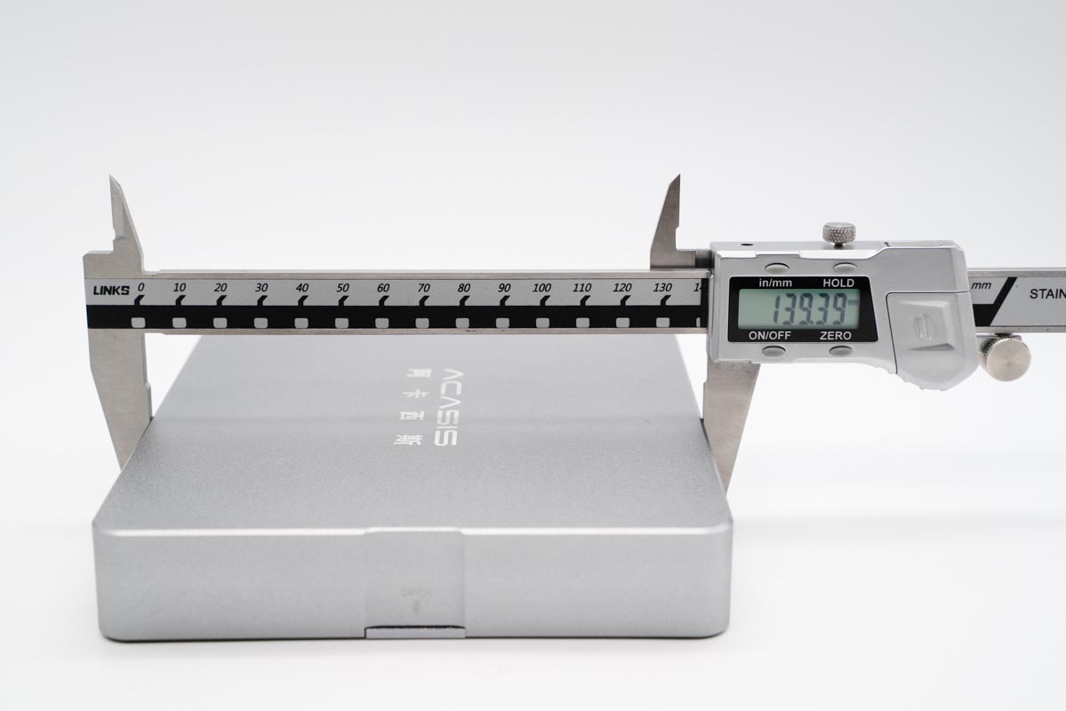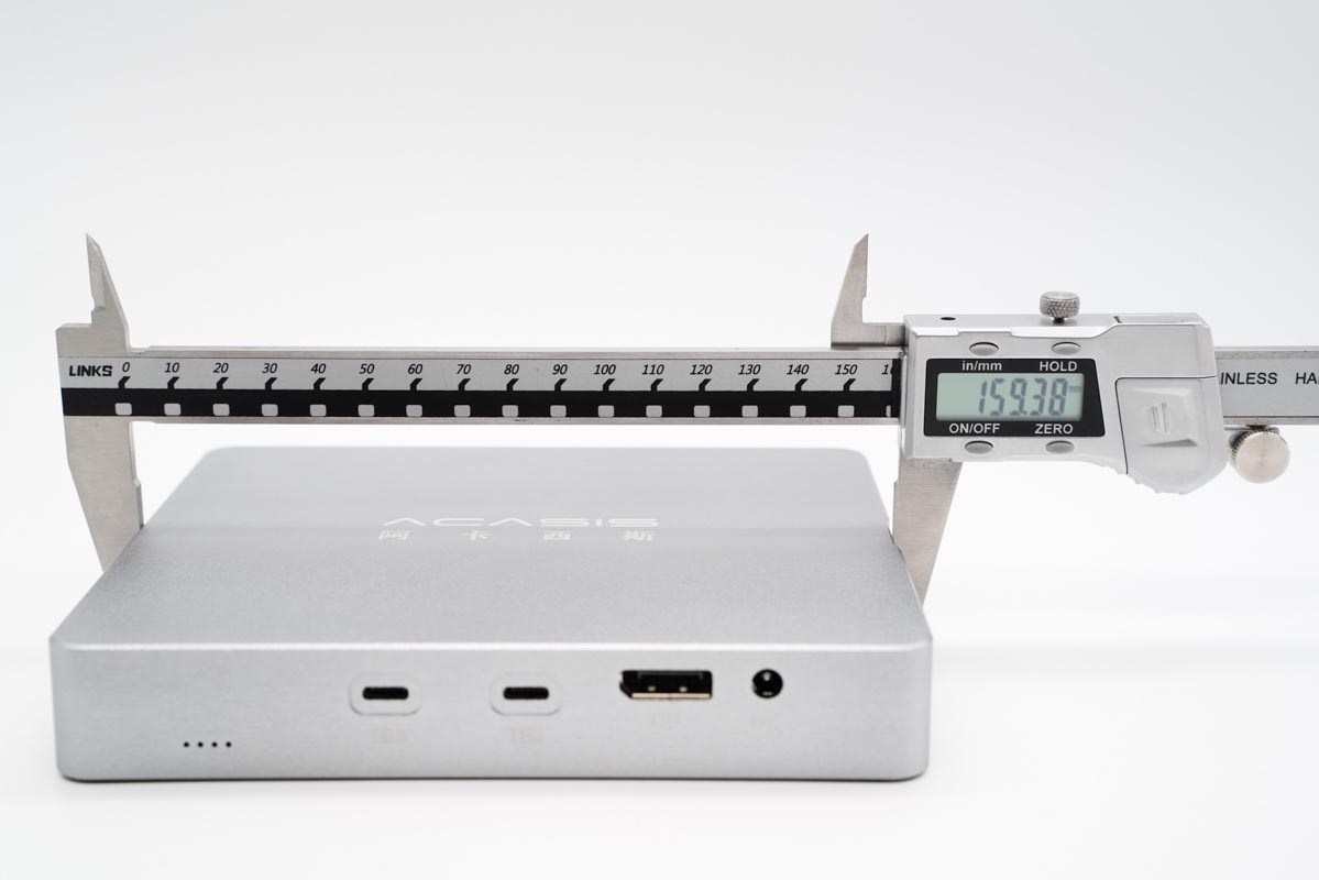 使用卡尺实测硬盘盒拓展坞长度约为159.38mm。