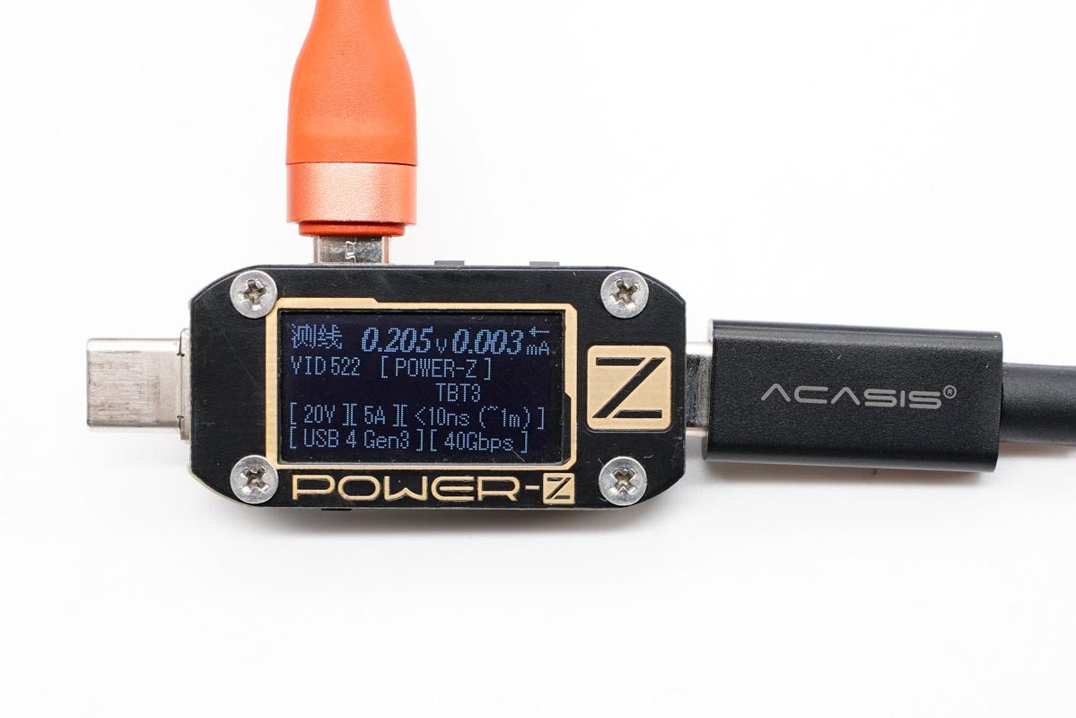使用ChargerLAB的POWER-Z KM001C读取线材的信息,实测线材支持20V5A 100W的充电功率,支持40Gbps的传输速度,USB标准为USB4 Gen3。