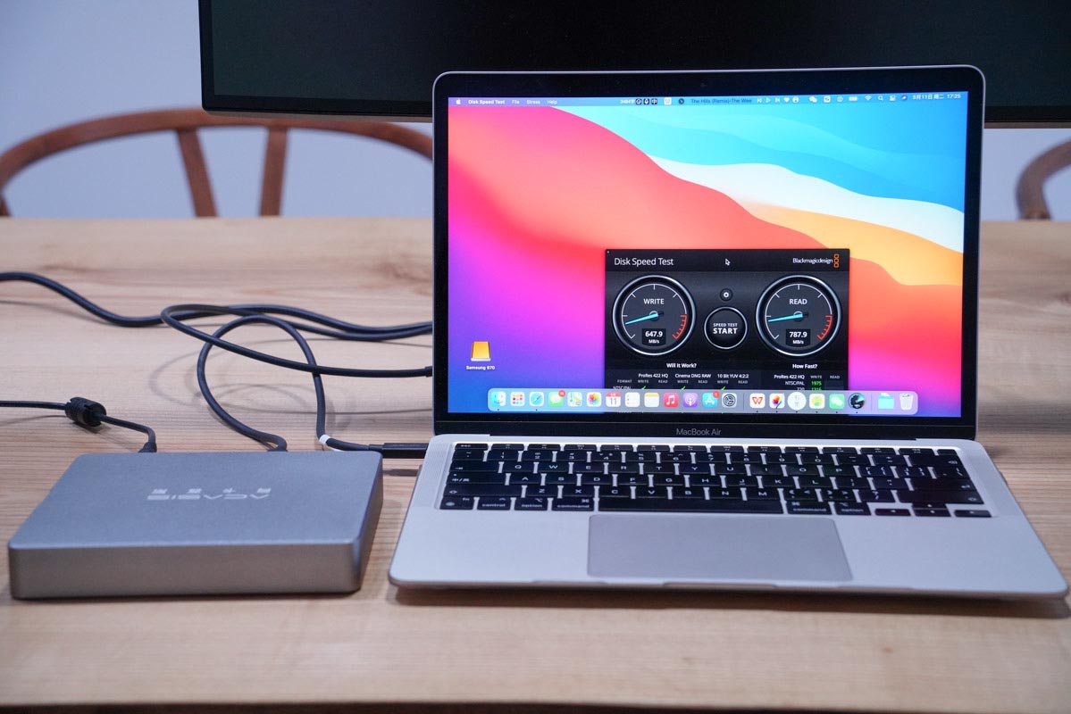 使用Mac端的Disk Speed Test测试硬盘盒的传输速度,实测写入速度为647.9MB/s,读取速度为787.9MB/s。