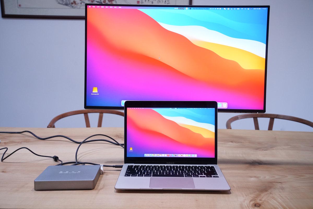上面使用2条雷电3数据线可以实现拓展大屏幕的高分辨率显示器,但这需要有前提条件,就是显示器需要配备USB-C物理接口且也要支持视频传输。这就形成了不方便之处,一方面2个雷电3接口全部被占用,另一方面用于视频传输外接显示器的DP接口反而闲置了。