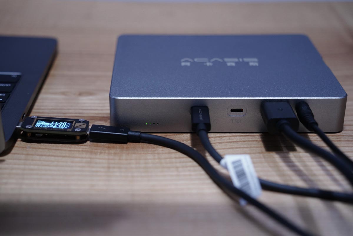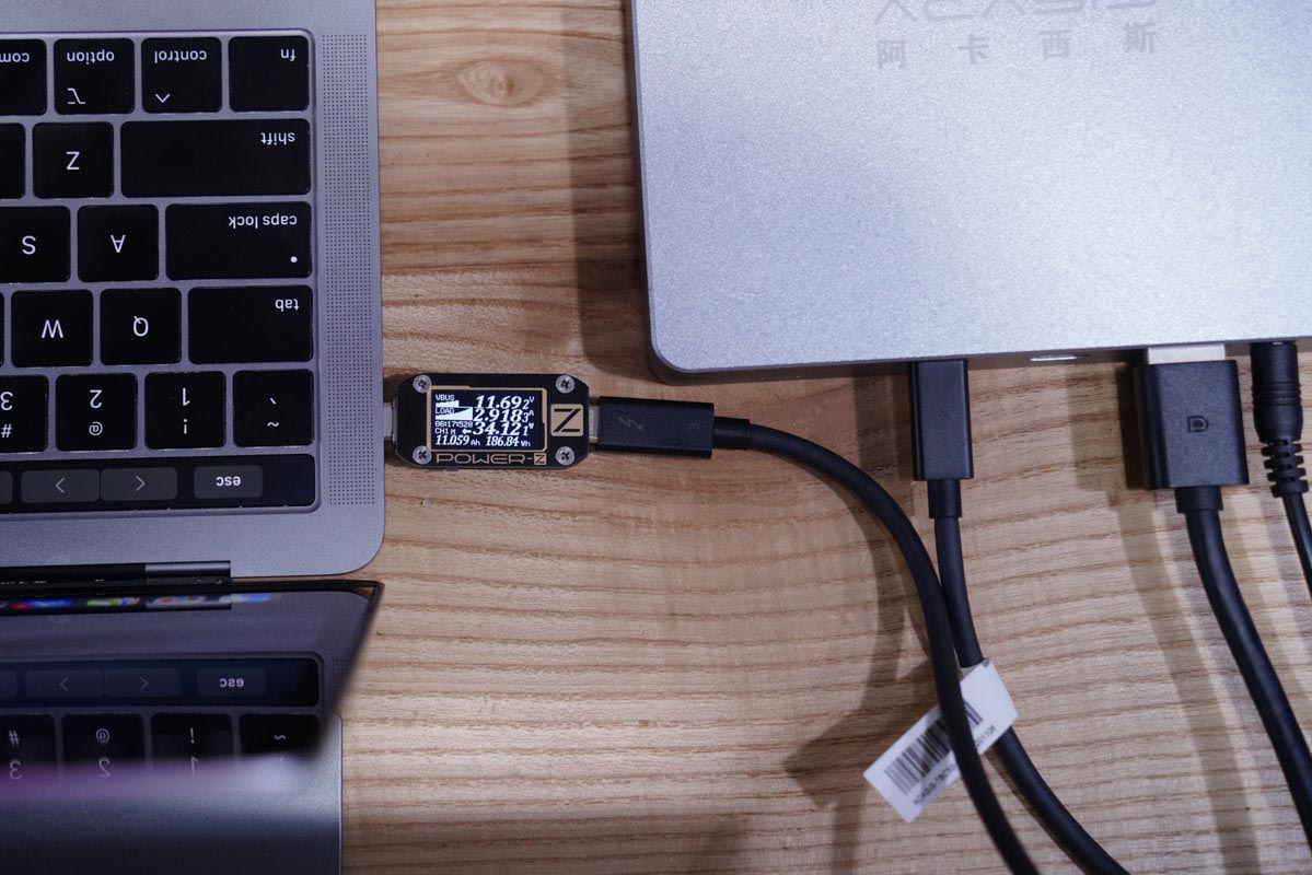 雷电3接口连接笔电除了可以提供拓展外还可以为笔电进行充电服务,实测为MacBook充电可以提供36W左右的充电功率。