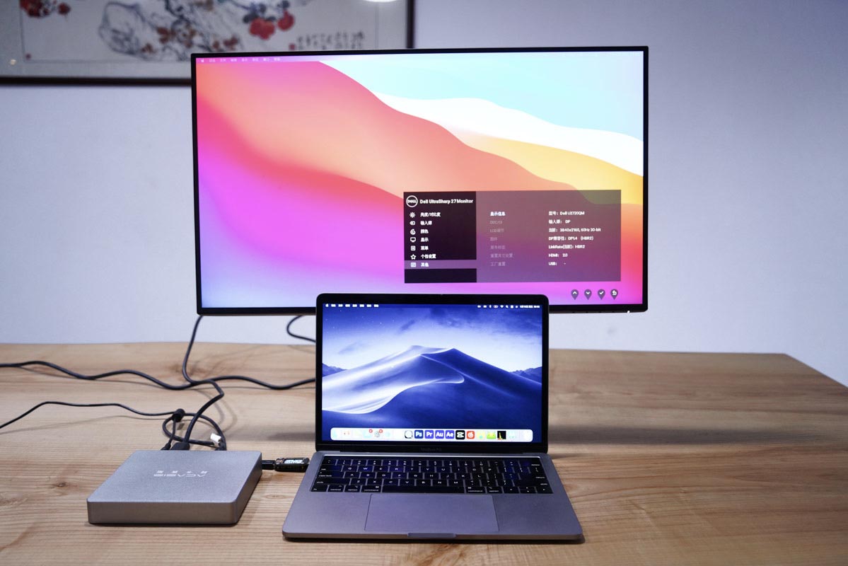 固态硬盘盒的1个雷电3接口通过雷电3数据线连接笔电的USB4接口,使用另一个雷电3接口通过雷电3数据线连接戴尔U2720QM 4K显示器。