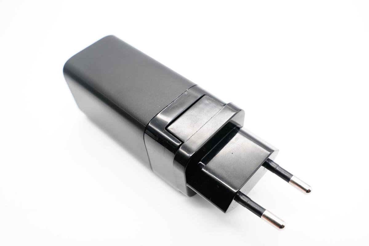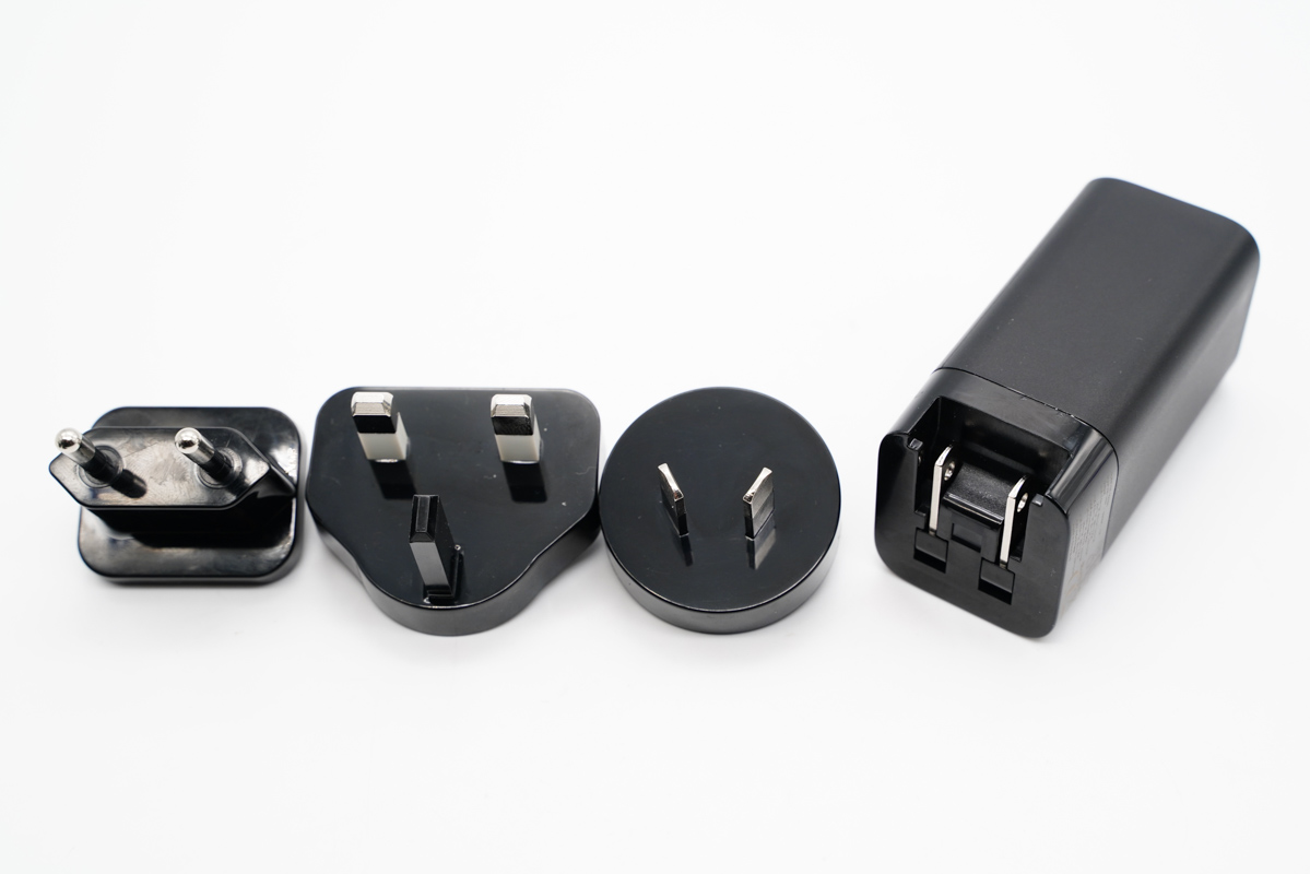 PYS鹏元晟65W双口充电器外壳采用磨砂黑和亮黑两段式设计,插脚可以折叠,标配美规插脚通用国内国标插座。此外PYS鹏元晟还同步推出了三款多国转换插头可供使用,即使出国也可以无缝衔接使用快充。