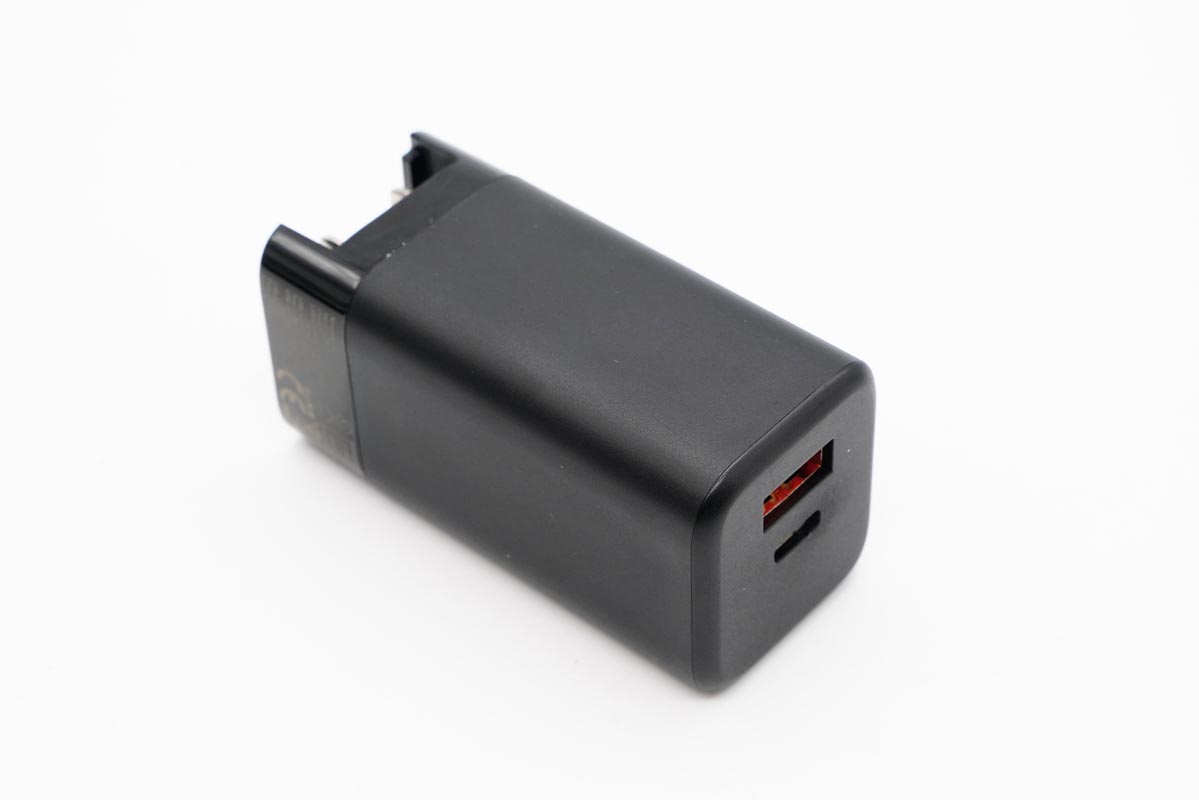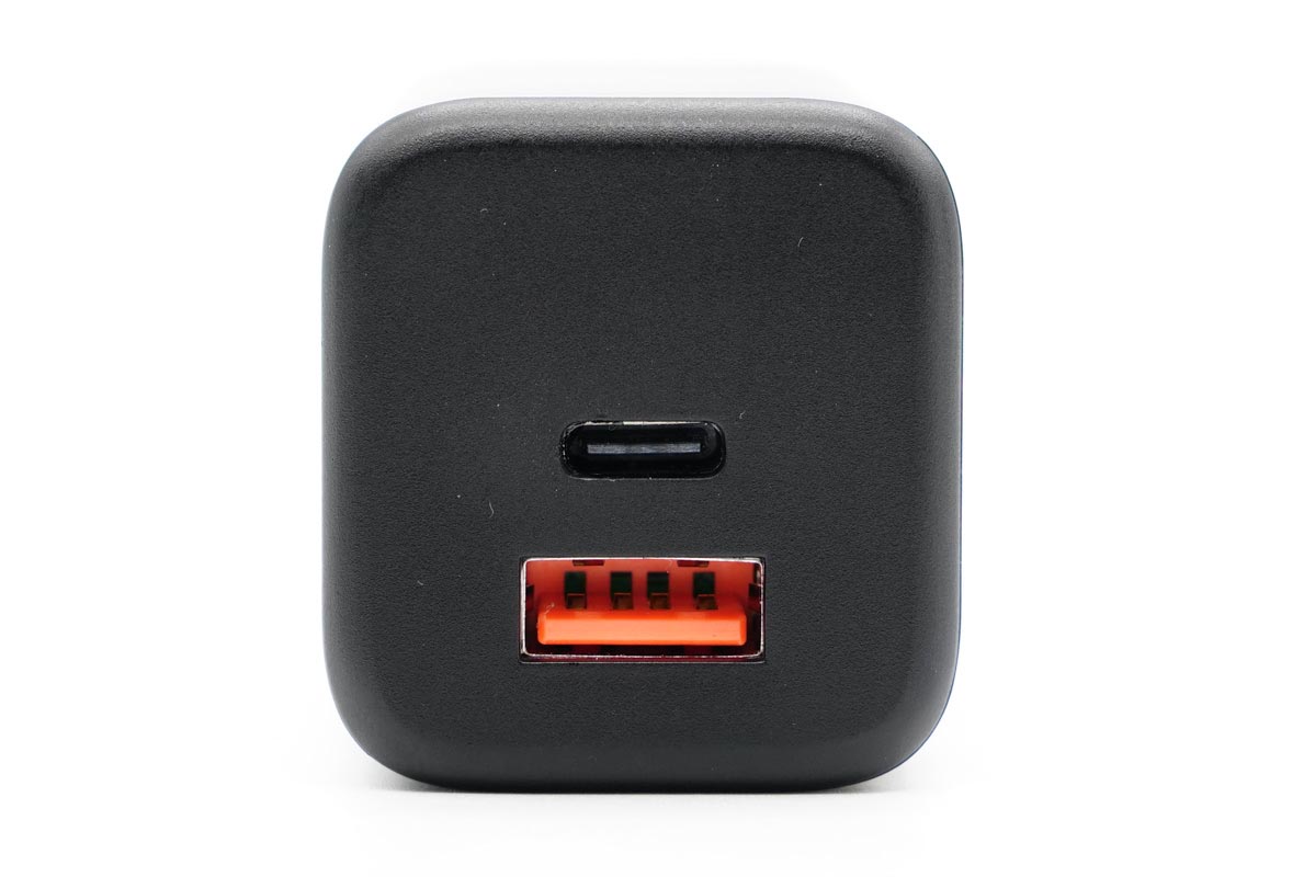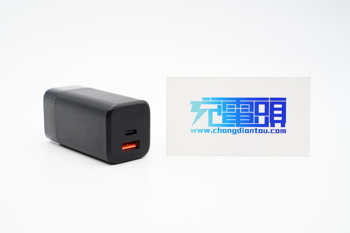 接口面板位置,充电器配备1C1A双USB输出接口,USB-C位于正中间位置,USB-A内部为橙色胶芯,想必也是支持快充的。