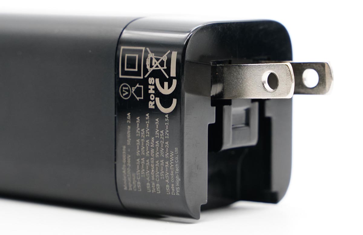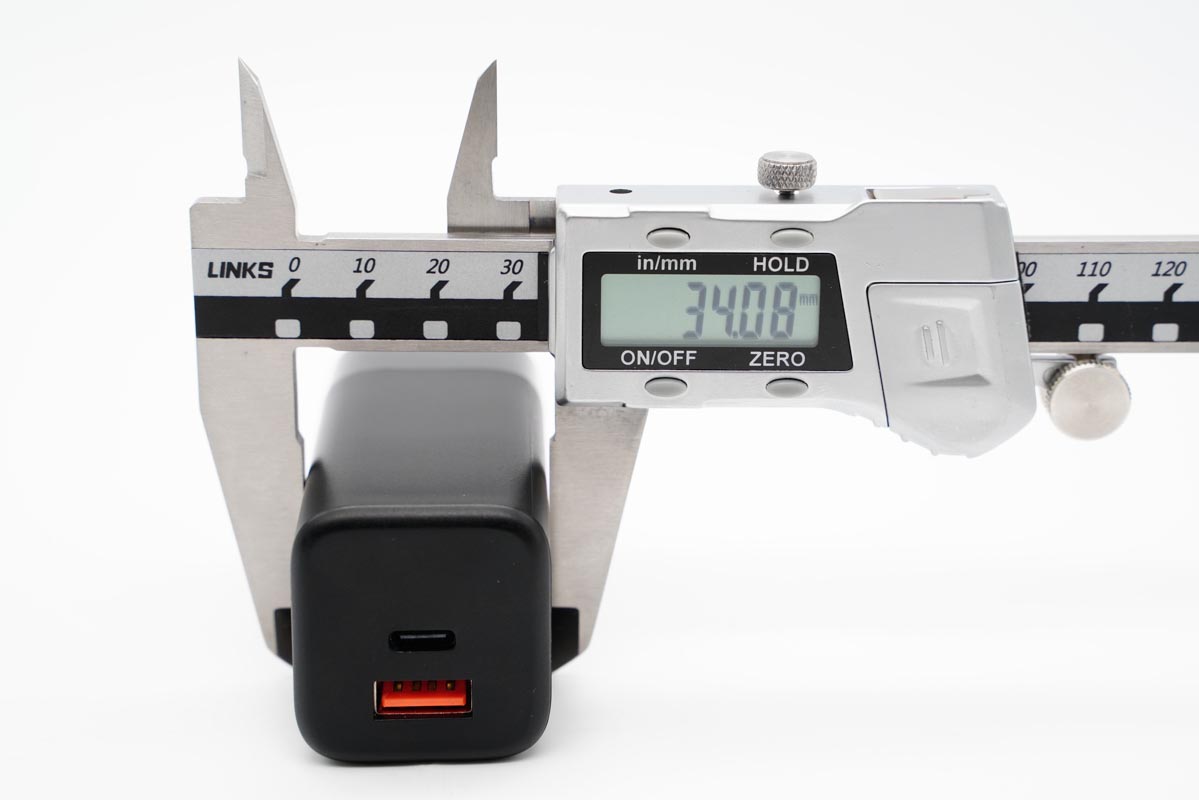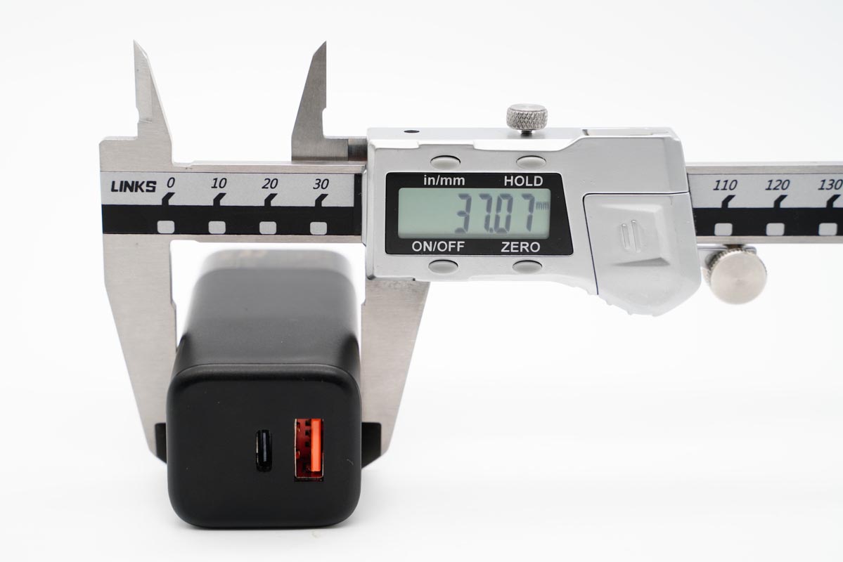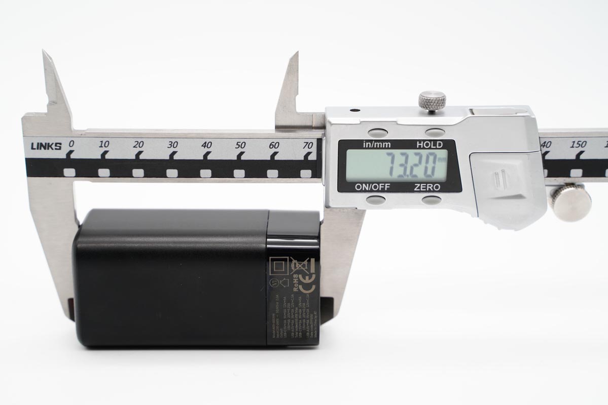由此可以得出充电器的三围参数为73.2x37.07x34.08mm,充电器的体积约为92.47cm³,以最高输出65W计算,功率密度约为0.70W/cm³。