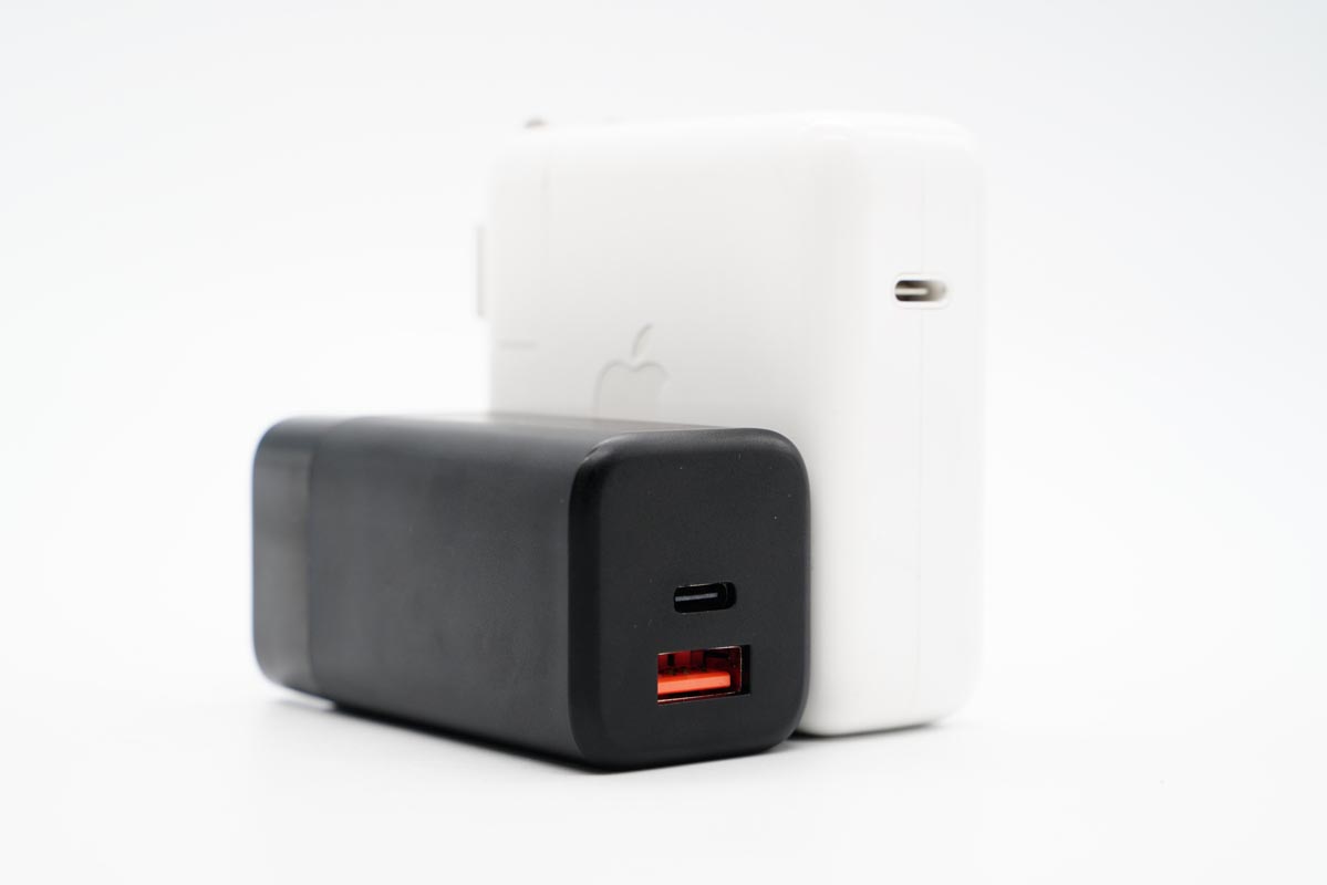 整体和苹果61W充电器对比一下,功率对比后者要高,体积对比后者要小很多。
