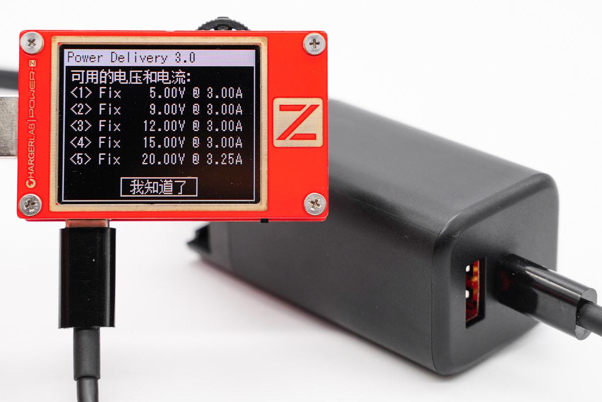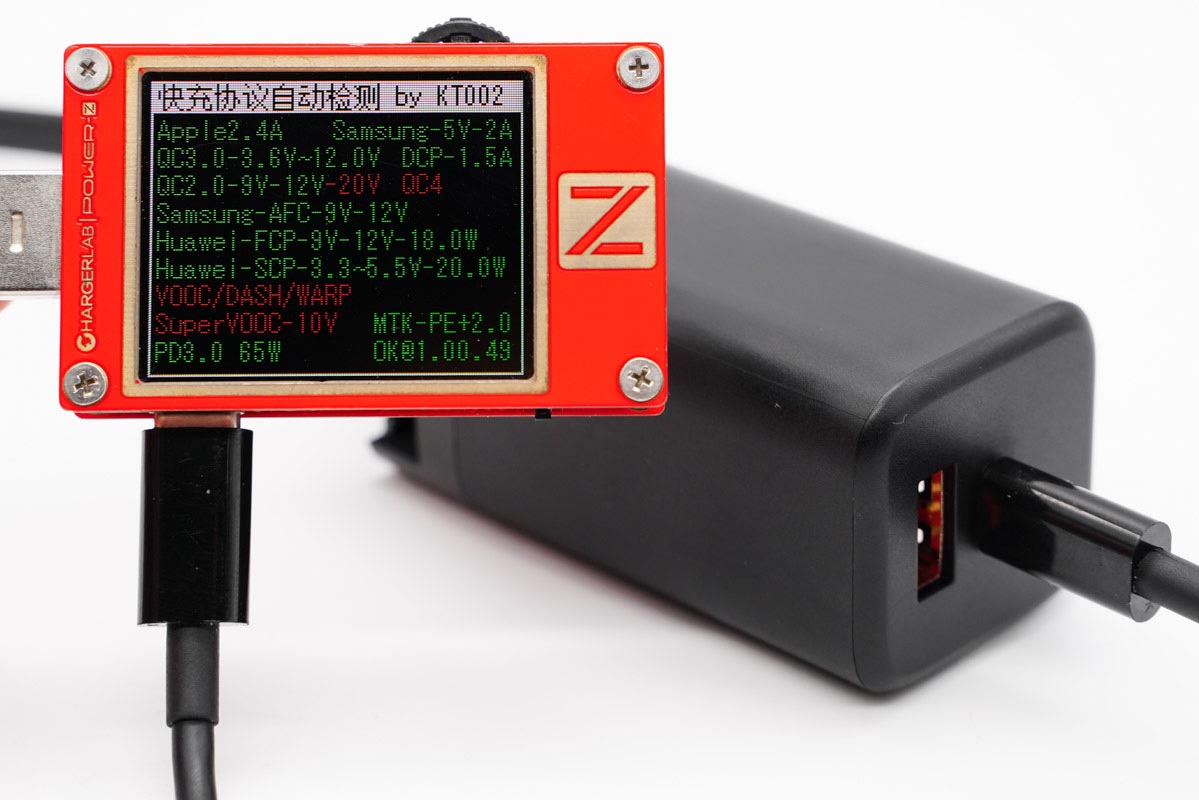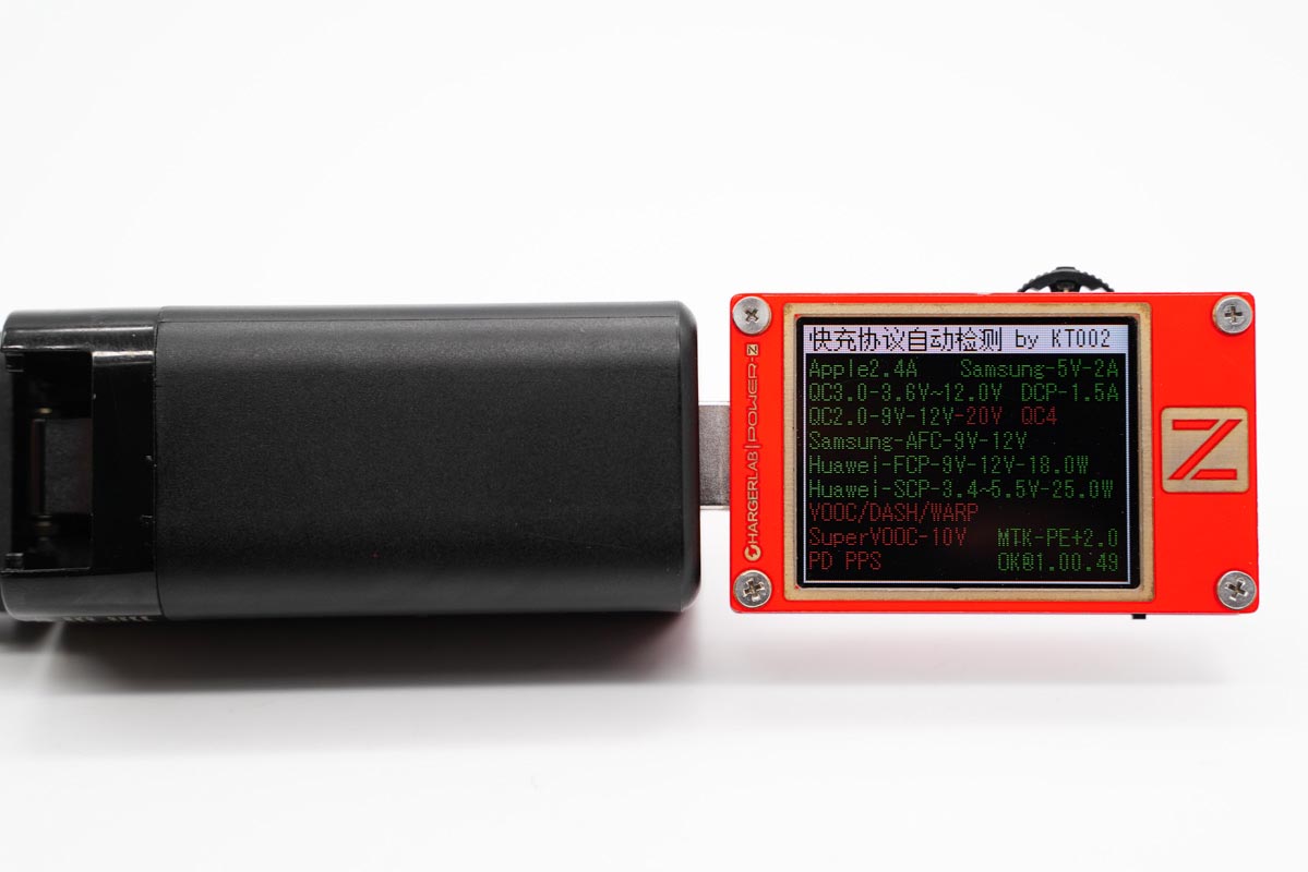 使用ChargerLAB的POWER-Z KT002读取充电器的快充协议,实测支持PD、Apple2.4A、QC2.0、QC3.0、AFC、FCP、SCP、MTK-PE等快充协议。