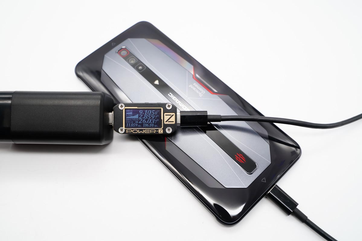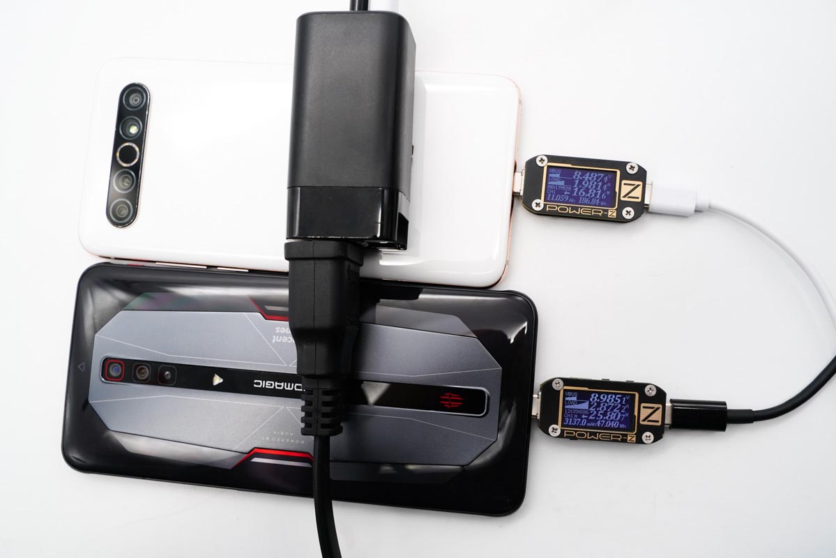 使用USB-C为红魔6 Pro充电,功率为25.80W,同时使用USB-A为魅族17 Pro充电,功率为16.81W,充电器支持双口同时输出且均处于快充状态。