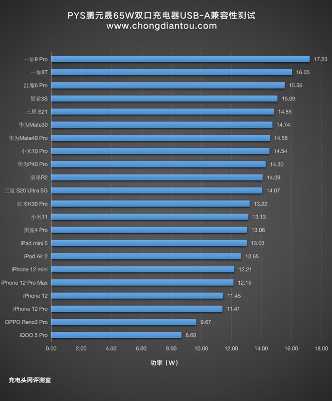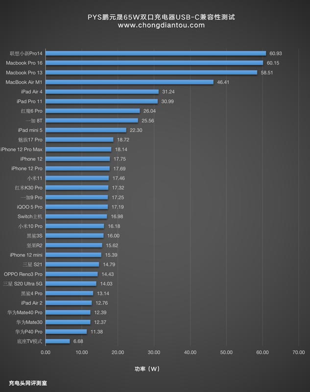 整个柱状图中笔电的功率自然最高,实现遥遥领先的局面,手机这里功率表现常规,在13W-26W左右不等。排在后面的机型是因为自身对于PD快充的功率限制所以最终的数据呈现较低。不过也是处于9V快充状态。