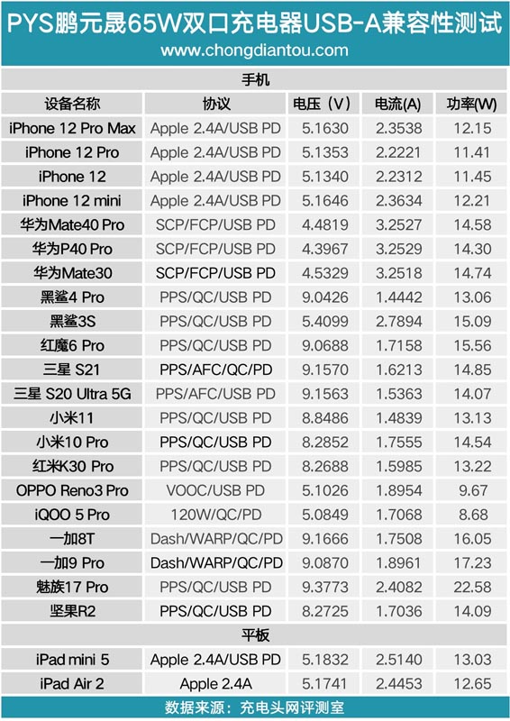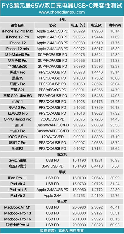 从测试数据来看,手机这里基本都是清一色的9V快充,iPad和笔电等较大功率需求的设备可以触发15V或20V高压快充,兼容性不错。