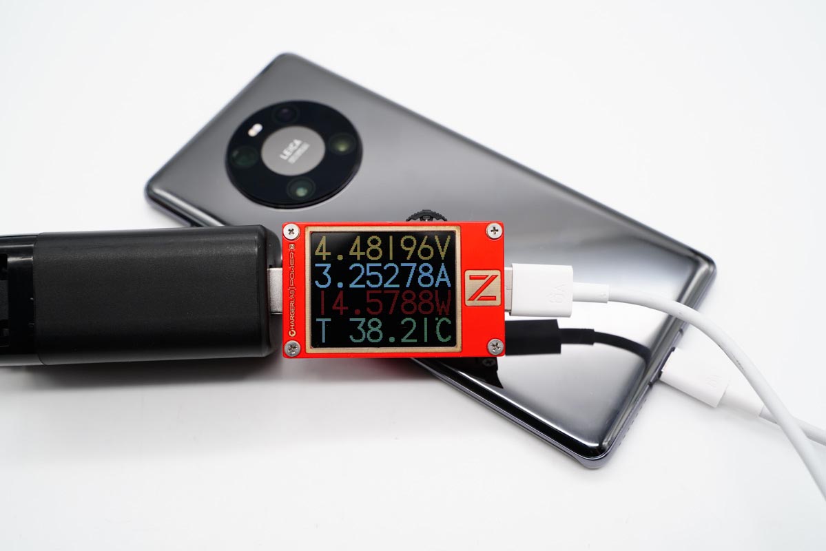 USB-A支持SCP快充协议,为华为Mate40 Pro充电时功率为4.48V 3.25A 14.57W,已经触发SCP快充协议,只不过功率表现稍差一些。
