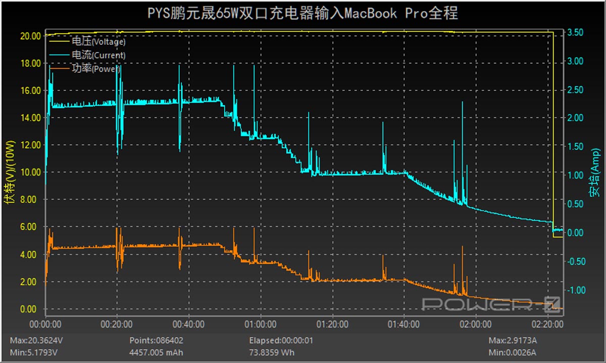 PYS鹏元晟65W双口充电器支持65W的大功率输出,这样的功率段已经可以为笔记本电脑提供充电服务了,所以此次小编加入了为笔记本充电全程的相关测试。以MacBook Pro为例,来看看充电全程的数据变化。