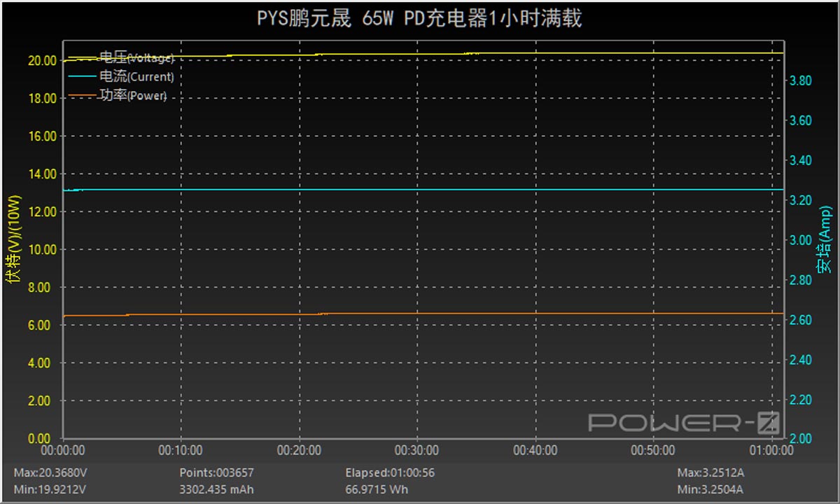 让充电器以20V3.25A 65W的功率持续满载输出1小时,1小时后可以看到电压呈水平直线输出状态,整体输出非常稳定。