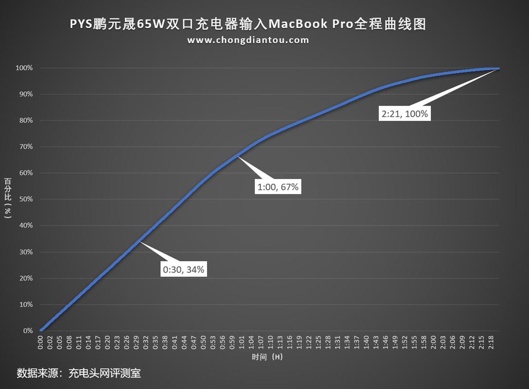 将充电全程绘制成曲线图,从曲线图中可以看出PYS鹏元晟65W双口充电器可以为MacBook Pro半小时充电34%,1小时充电67%,完全充满需要2小时21分。