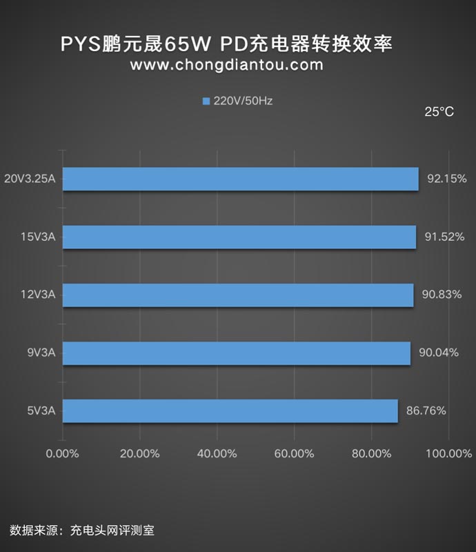 我们平时看充电器上面的参数输出100W或者65W是充电器可以为设备提供的最大输出功率,但充电器从插座上汲取的功率往往要更大一些,下面是PYS鹏元晟65W充电器在220V 50Hz和110V 60Hz交流输入的情况下分别进行了转换效率测试,测试结果如下: