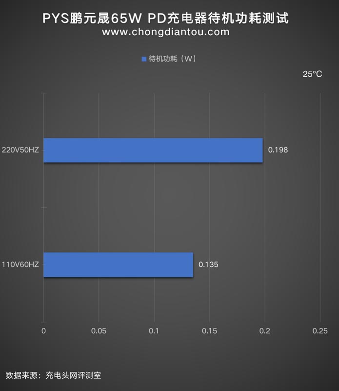 经过功率计测试,PYS鹏元晟65W充电器在220V 50Hz的空载功耗为0.198W,换算下来一年损耗的电能约为1.73KW·h,若市价电为0.6元/KW·h,则充电器一年的空载功耗约为1.03元左右。