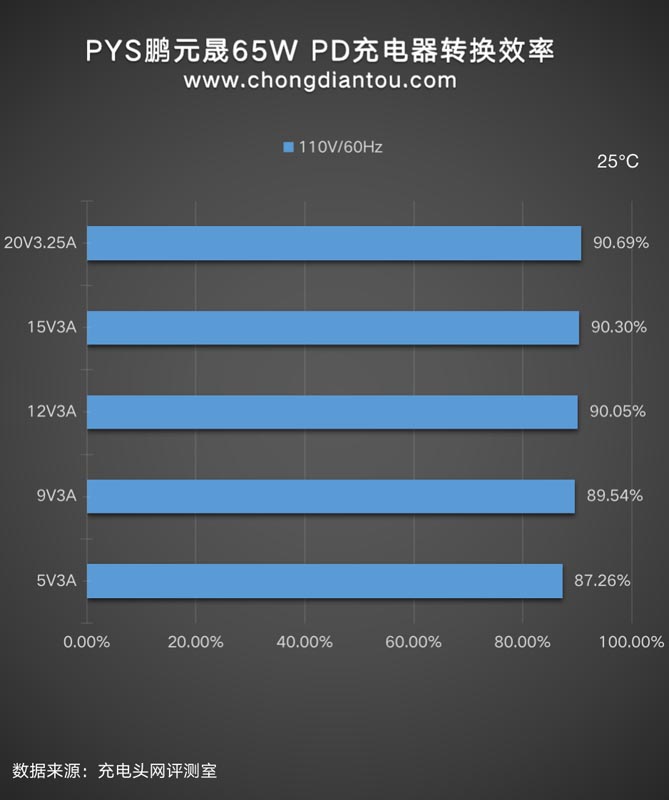 110V 60Hz下,充电器的转换效率从87.26%到90.69%不等。