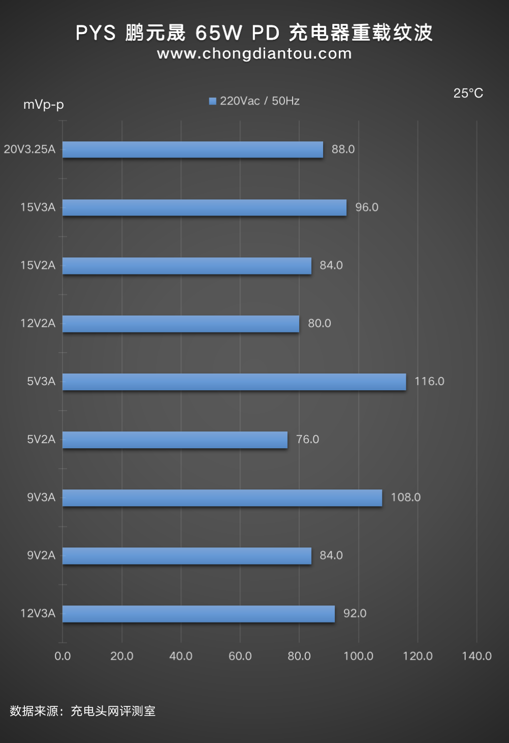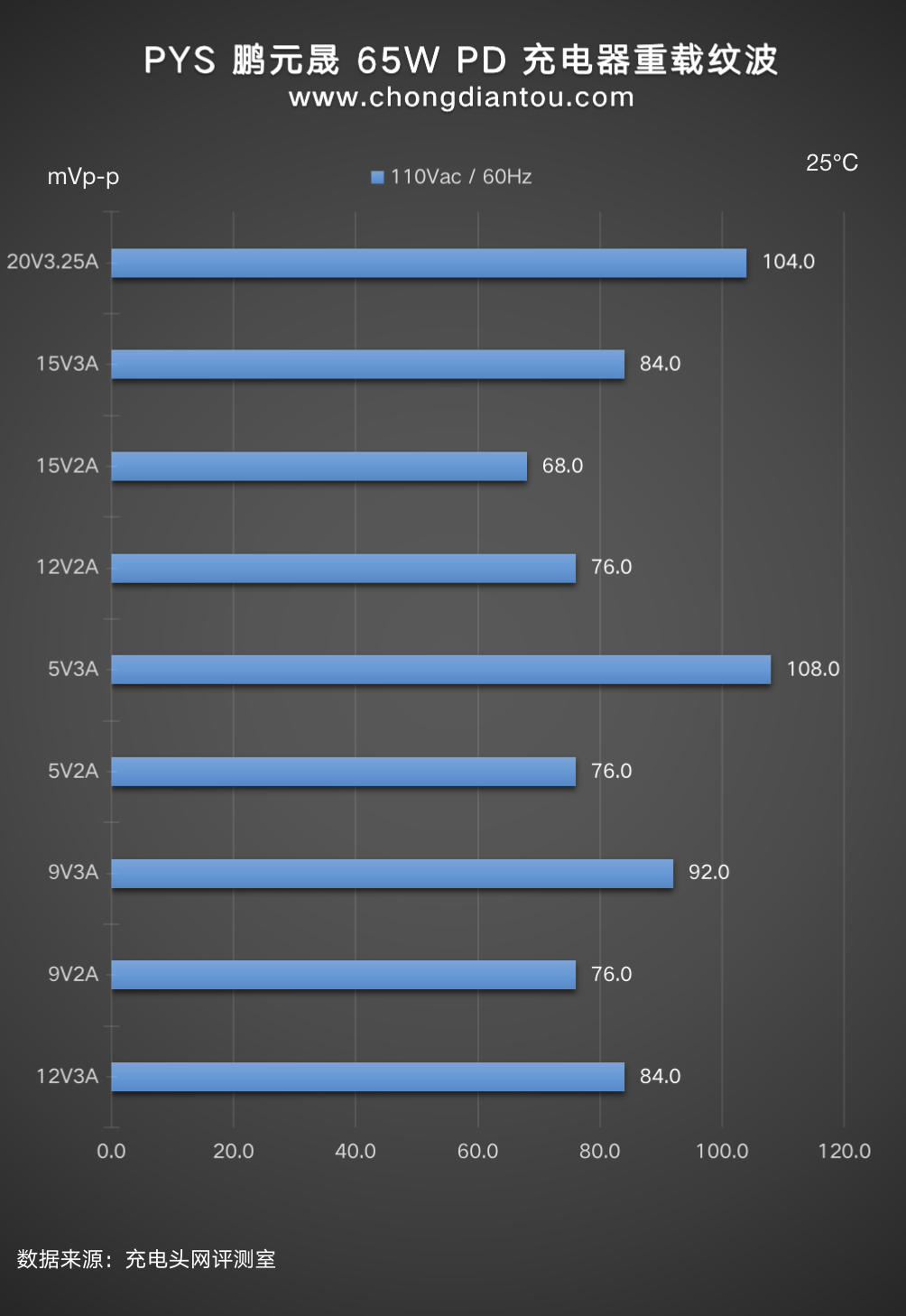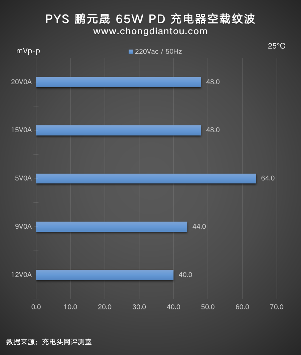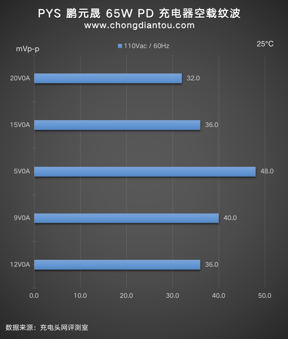 国家标准中充电器纹波要求是不高于200mVp-p,PYS 鹏元晟 65W 充电器在110V 60Hz、240V 50Hz输入电压下,所有输出功率纹波峰峰值均低于200mVp-p这个标准很多,表现不错。