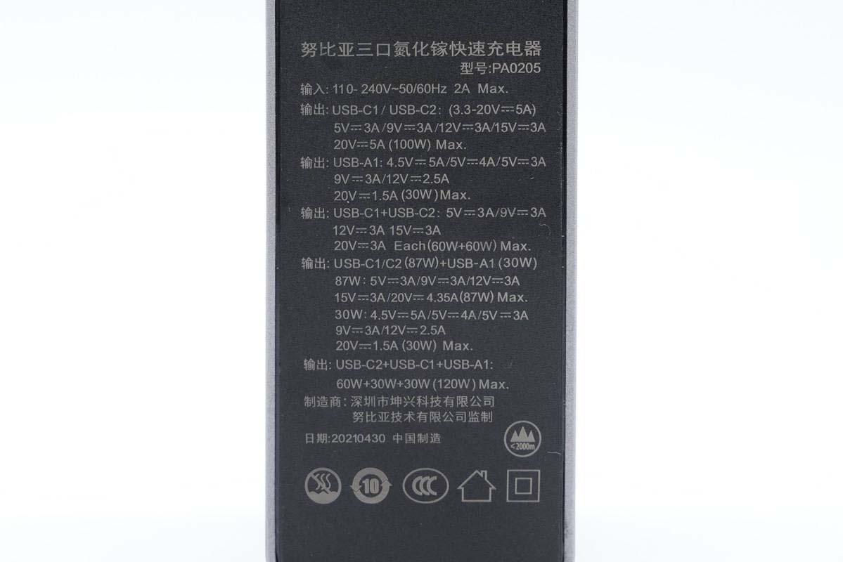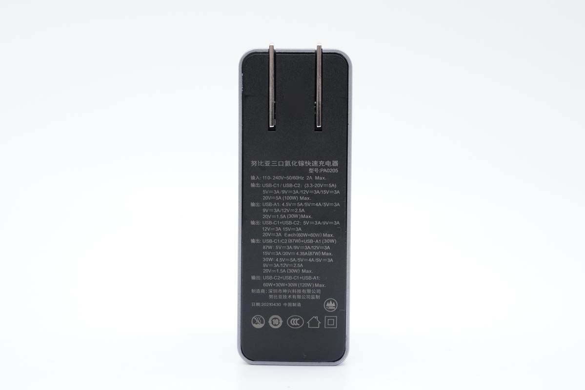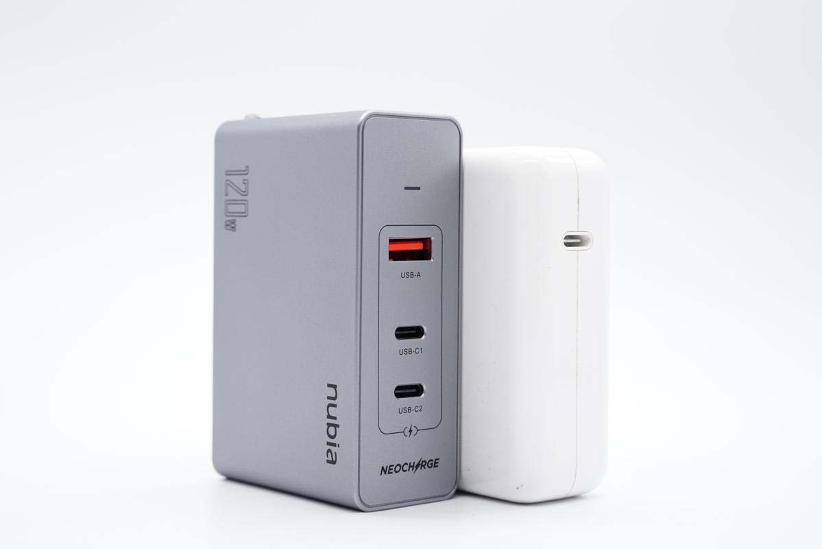 和苹果96W充电器直观对比,努比亚这款充电器更“瘦”也更“高”一些。