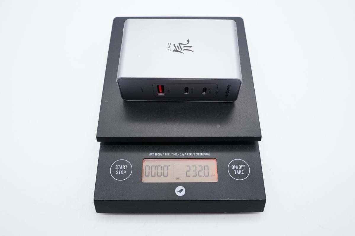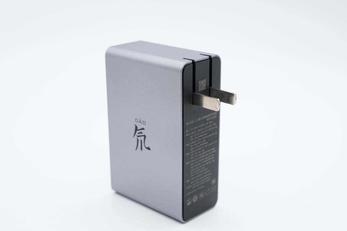 包装盒延续氘(dao)系列ID设计,顶部印有产品名称、外观,以及2Type-C + USB-A、120W特性。