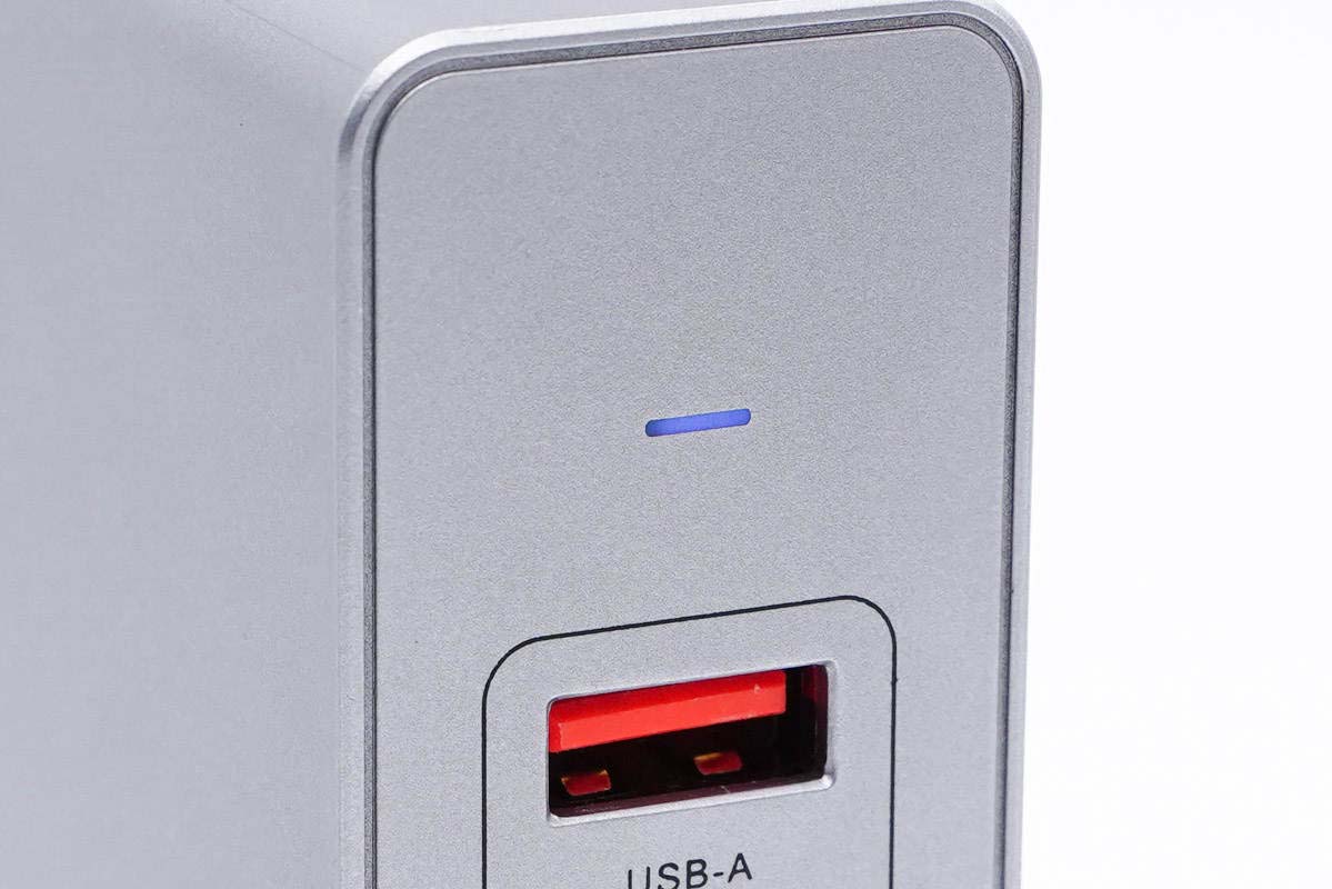 输出端配有LED灯以及2C1A三个接口,分别为黑色和橘红色胶芯。