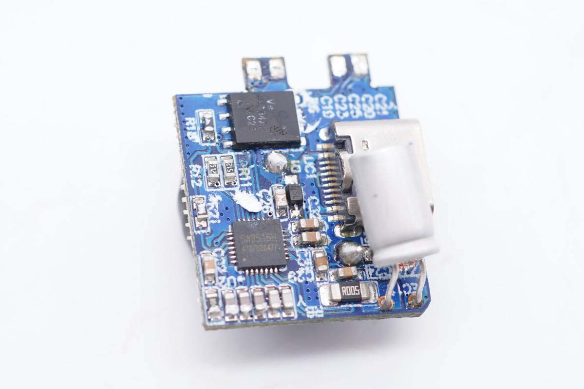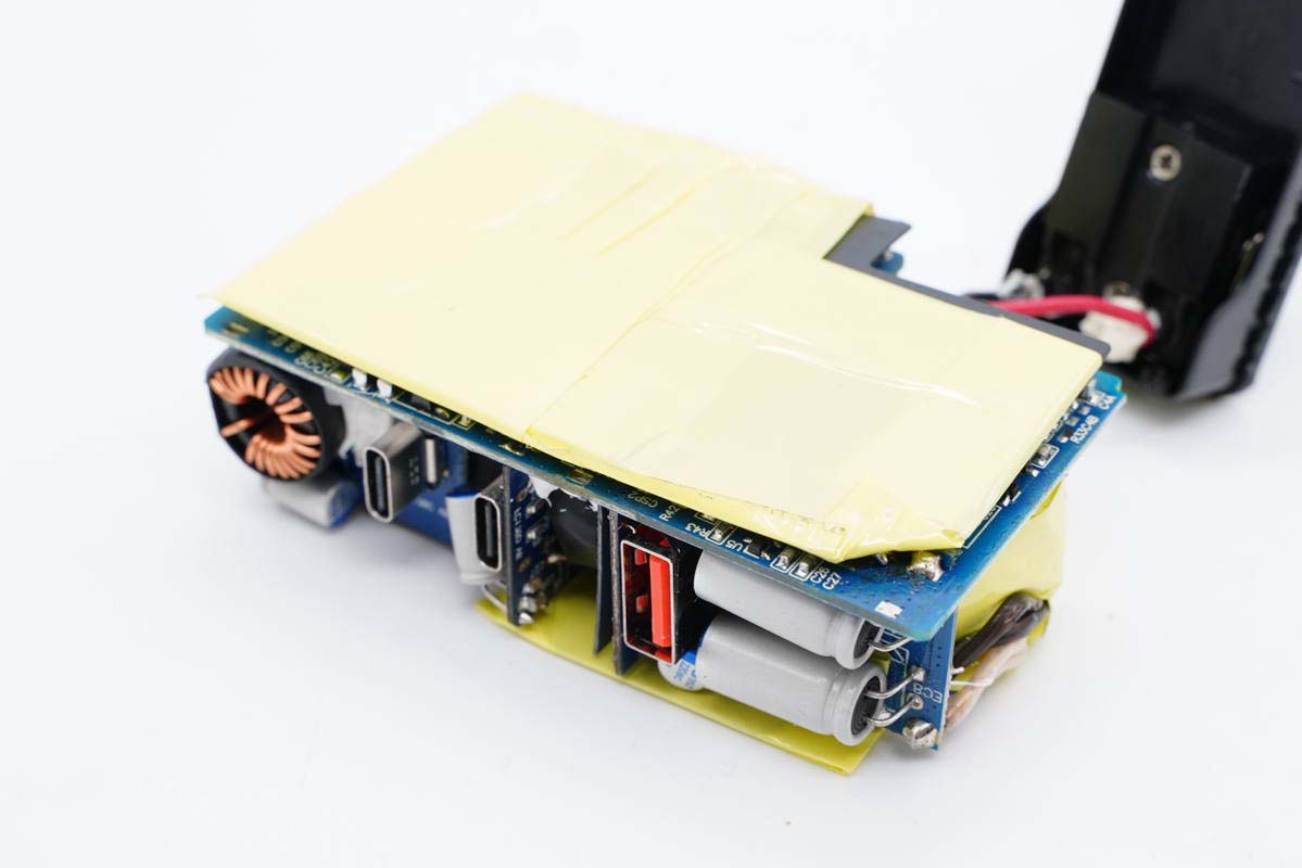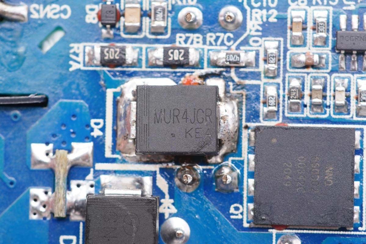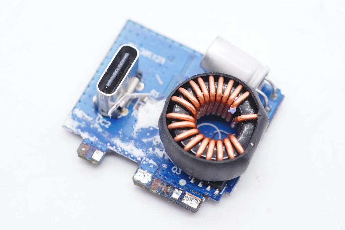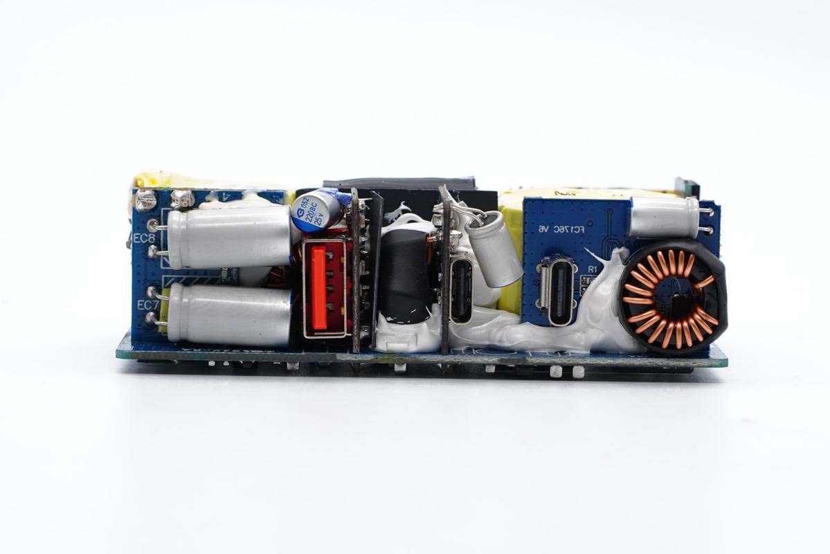 USB-A母座所在小板拆下,正面设有降压电感和滤波固态电容,母座粘贴绝缘胶带可防止异物进入充电器内部。