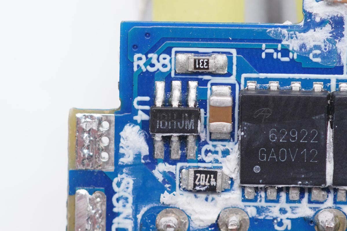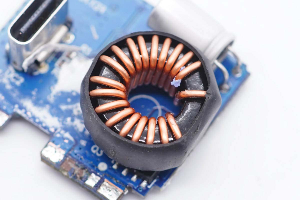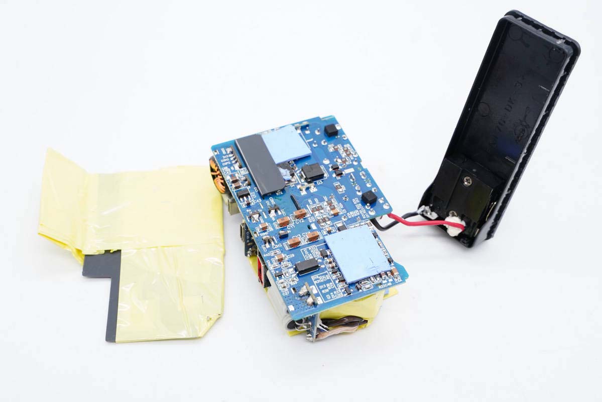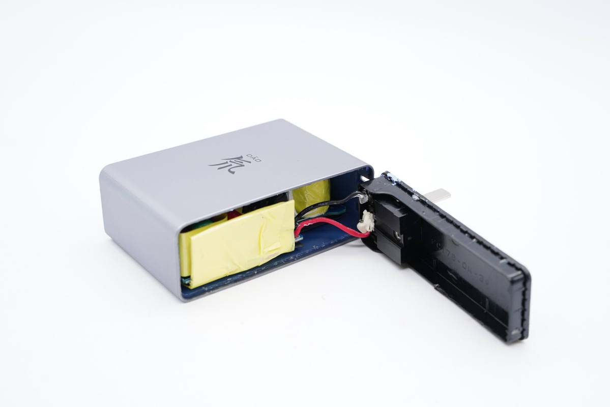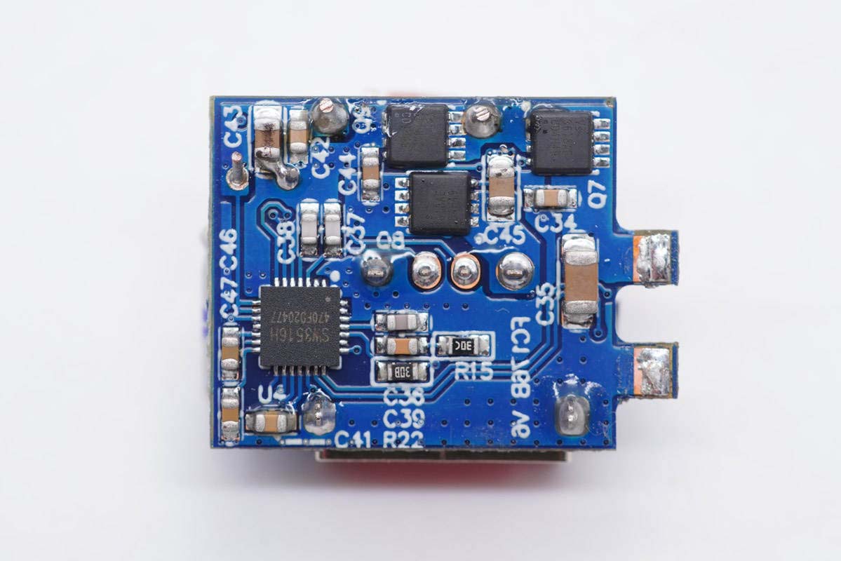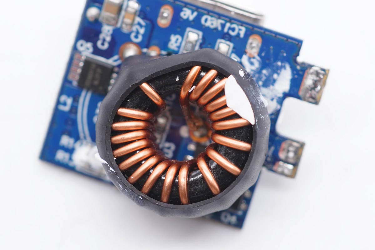USB-A母座所在小板拆下,正面设有降压电感和滤波固态电容,母座粘贴绝缘胶带可防止异物进入充电器内部。
