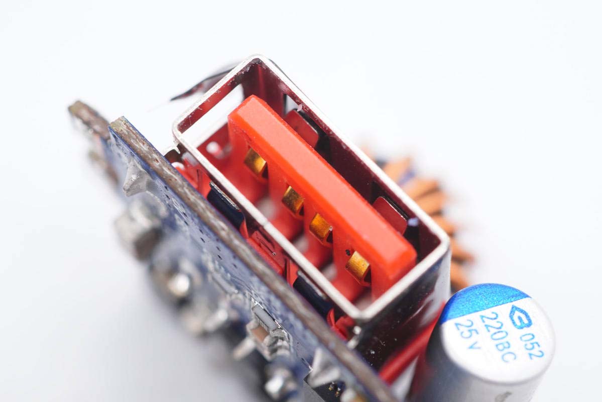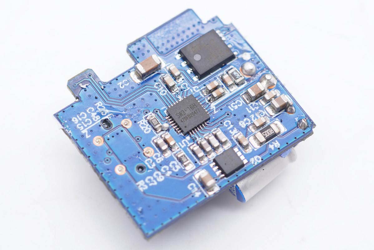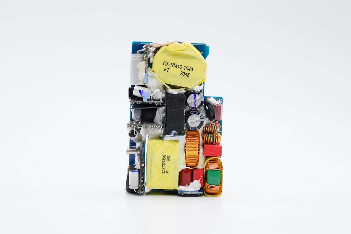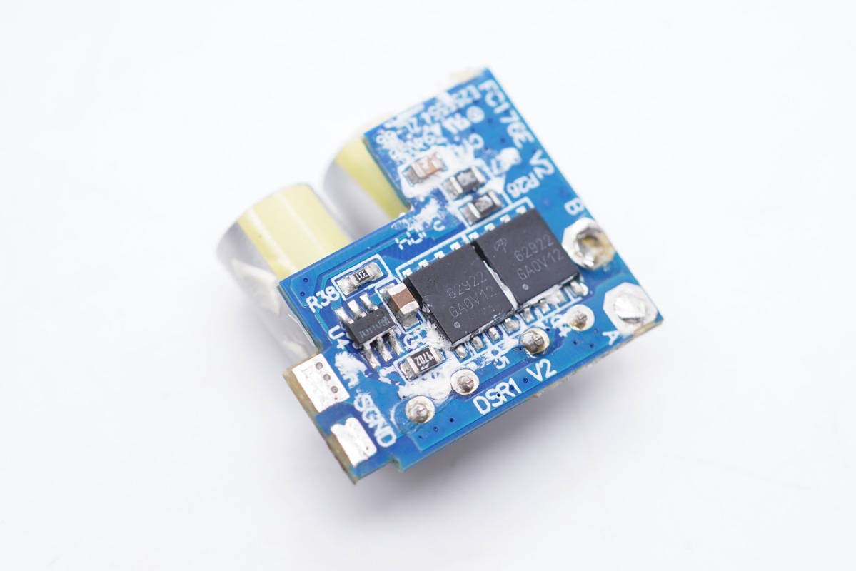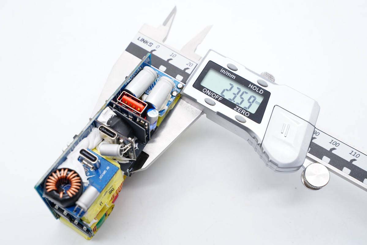 USB-A母座所在小板拆下,正面设有降压电感和滤波固态电容,母座粘贴绝缘胶带可防止异物进入充电器内部。