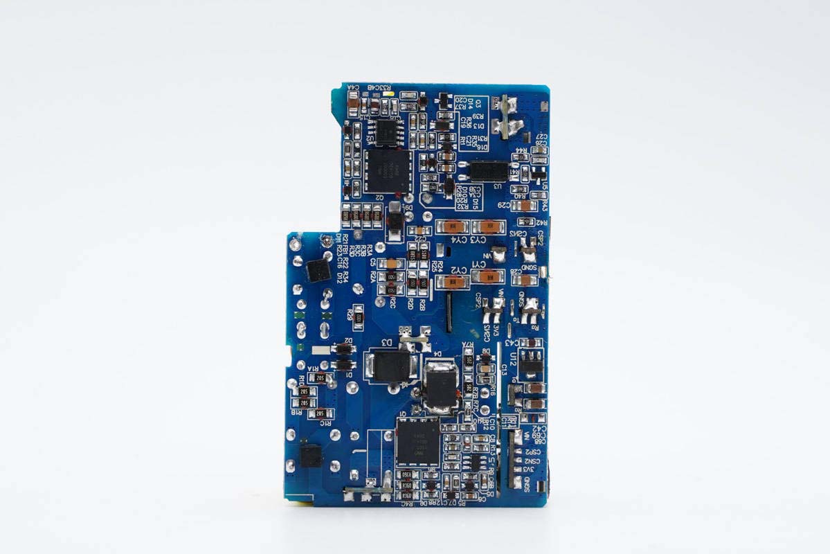 PCB板背面一览,上端是开关电源主控芯片、高压MOS管以及光耦,下面有PFC升压控制器、升压开关管以及升压二极管等。