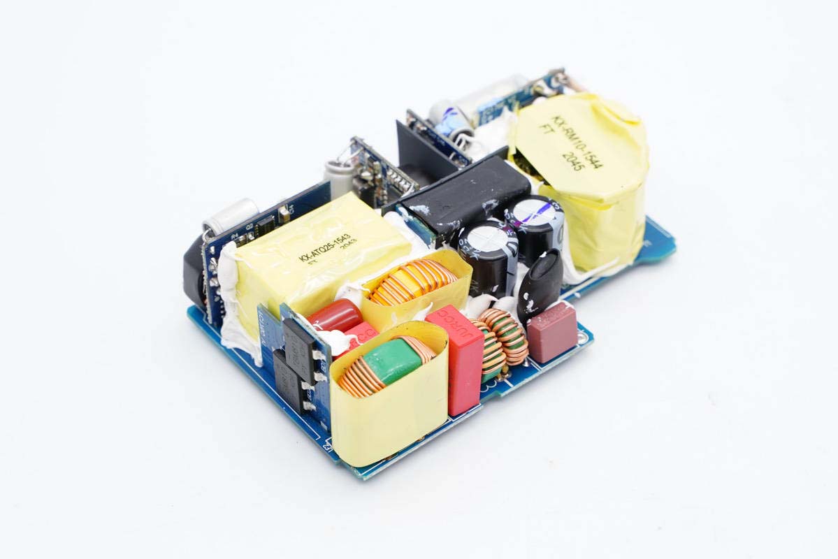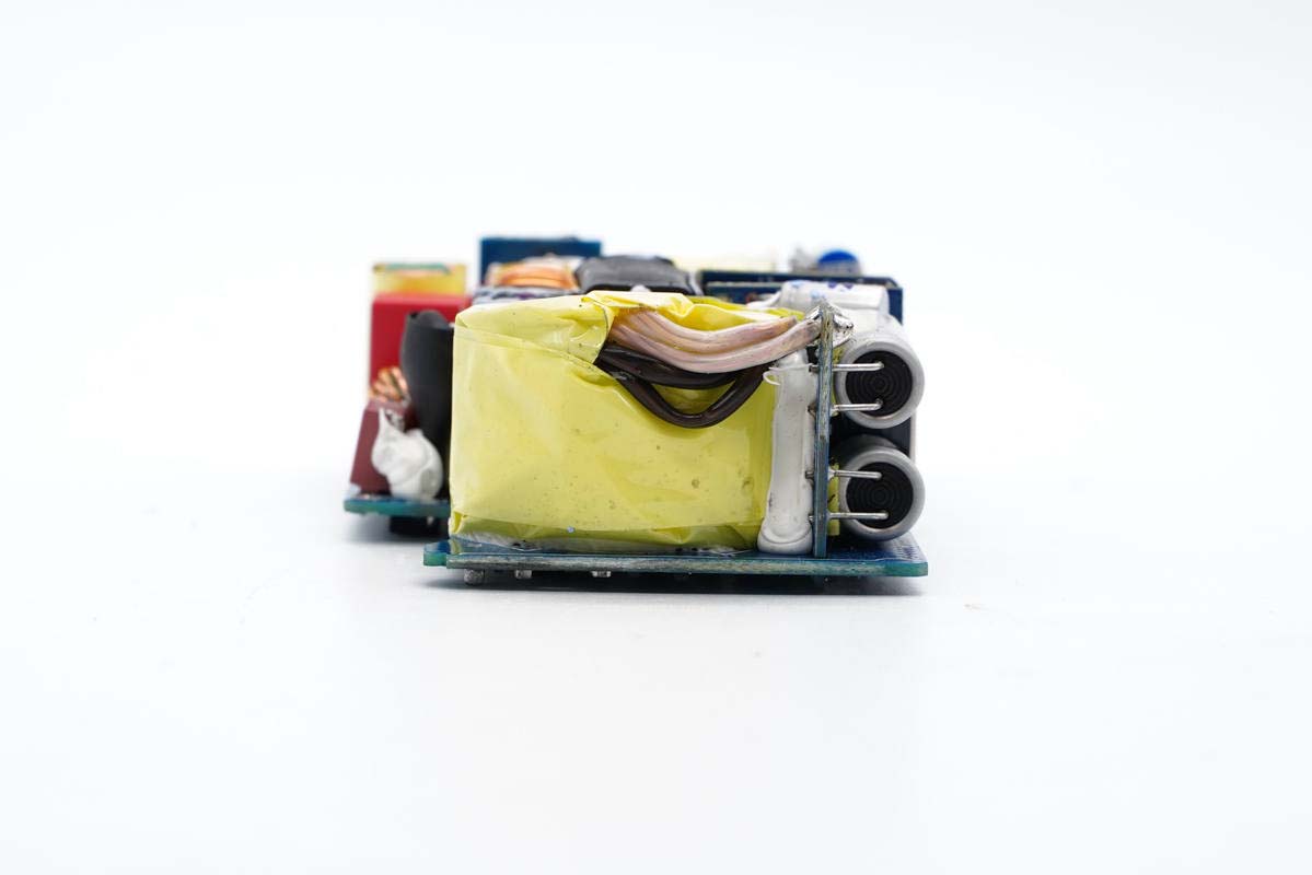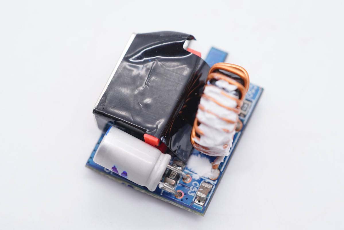 PCB板正面一览,元器件间的缝隙全部打胶帮助加固,其中两颗高压电容外套塑料胶套,此外还有绝缘板将其与输出端小板进行隔离。
